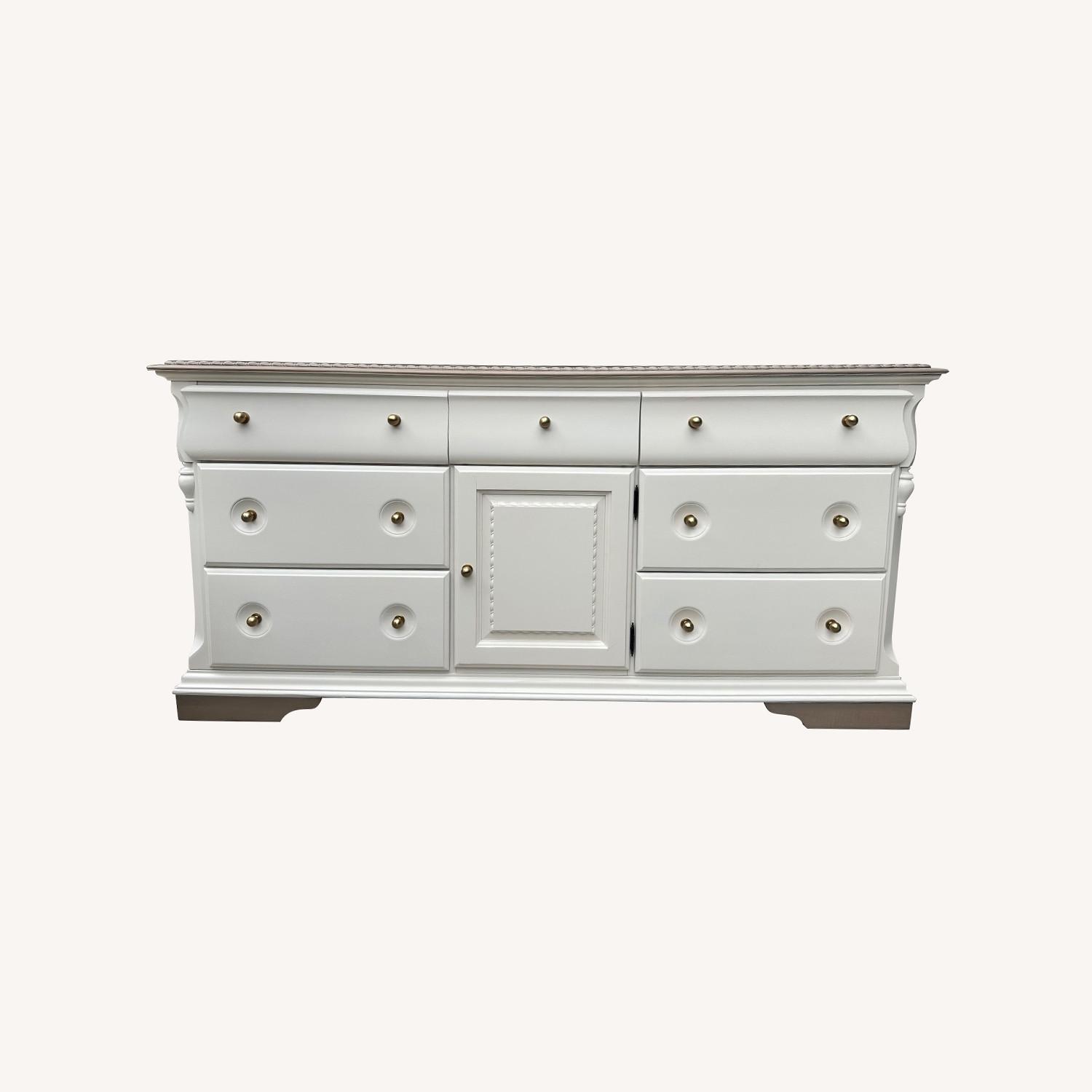 Seller's Notes:Professionally Refinished Broyhill Dresser & 2 Nightstands Solid Wood Furniture Dresser has 9 Drawers Nightstands has 2 deep drawers Set refinished in Sherwin Williams Emerald Paint in creamy, off-white, Raw Silk color, and the solid wood tops are finished with stain and water resistant finish. This furniture set is solidly made, very sturdy, and provides plenty of storage. All drawers work perfectly. Brand new Hardware Top sealed for durability and water resistance Dresser 66” Width X 18” Depth x 33” Height Nightstands 21 ” W X 15” Depth X 23” height Will separate set Dresser $900 Nightstands $ 600 Pick up from 30115 zip code All furniture available for purchase is vintage. Each item has been meticulously cleaned, restored, and repaired, complete with new hardware, ensuring it appears as good as new. Our workshop and home are smoke-free environments