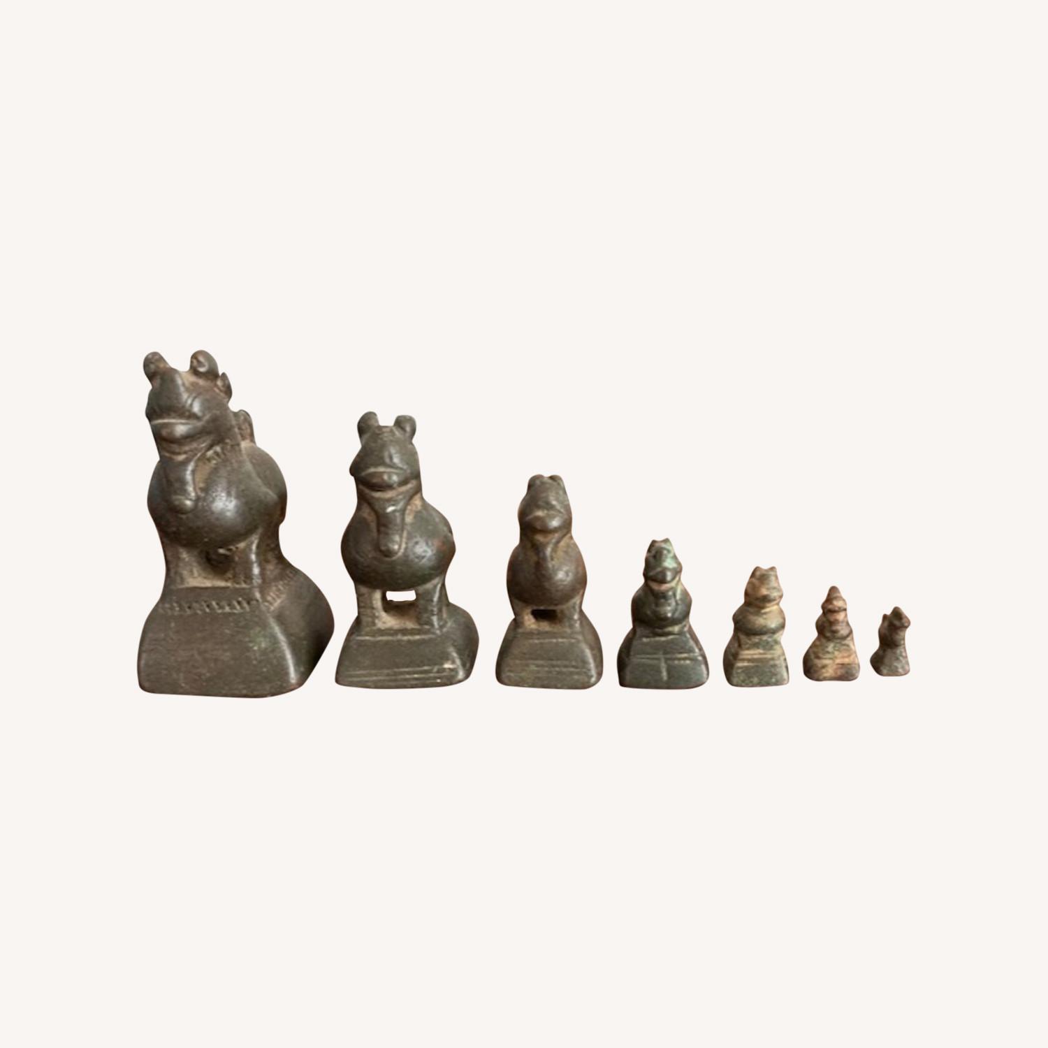 Seller's Notes:Set of 7 Antique Bronze weights used in Burmese markets to weigh valuables such as gold and silver in the 16th - 19th centuries. The animal design comprises the head of a rooster, the body of a bull and the tail of a horse. Acquired in Burma in 1958. The largest is 2.5" tall and the smallest is .5" tall.