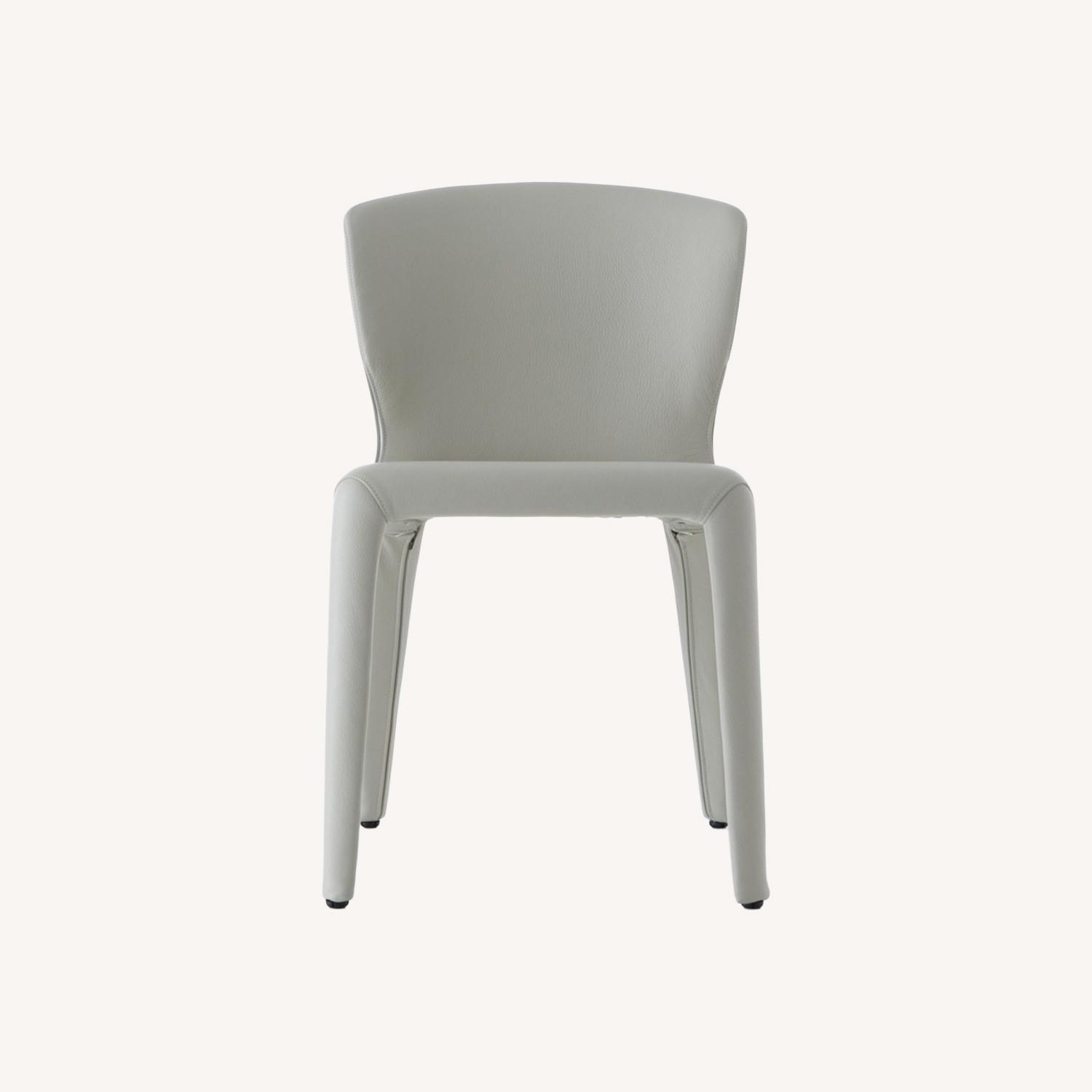 These chairs are upholstered in Scozia Bianco off-white leather — a refined, neutral tone that complements virtually any modern or contemporary interior. The leather is supple, luminous, and effortlessly sophisticated, offering both visual lightness and enduring durability.