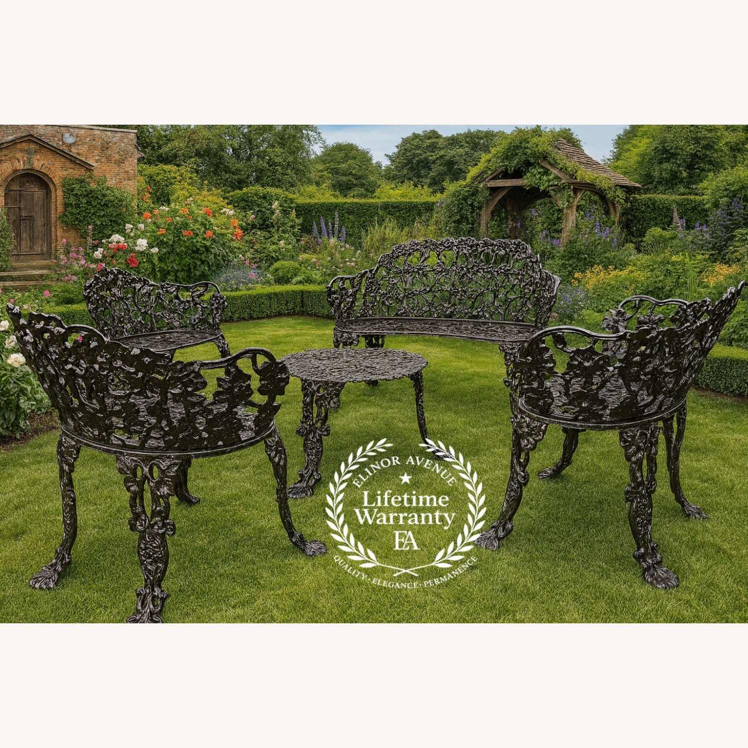 Seller's Notes:Mid-Century Cast Iron Grapevine Garden Complete Set – 5-Piece Victorian Revival, Made in USA Description: Offered is a stunning 5-piece vintage cast iron garden set in the highly sought-after grapevine pattern, featuring exquisite detailing throughout. This Victorian Revival ensemble includes one gracefully curved two-seat bench, three matching armchairs, and a round pierced floral-top table, all crafted from solid, heavy cast iron. The intricately cast grapevine motif—lush leaves and hanging clusters—recalls the opulent designs of 19th-century Coalbrookdale pieces but is American-made, with a “Made in USA” stamp beneath the bench seat confirming its provenance. There is also a casting or pattern number stamped above “made in USA” which is “3008” and the letter “d” below that. Produced likely in the 1920s to 1950s, this set exemplifies the quality of early 20th-century American foundries that honored traditional English patterns while creating heirloom-quality furnishings for refined outdoor living. The finish is a lustrous black enamel, recently refreshed to preserve its elegance and weather resistance. The set is structurally sound and exceptionally heavy, a testament to its authenticity and durability. Whether placed in a manicured garden, elegant veranda, or historic courtyard, this set makes a bold architectural statement and offers timeless beauty with practical function. *We offer a lifetime warranty on all purchases with us. Dimensions: Bench x 1: Weighs: 70 lbs Height: 28 inches Width: 37 3/4 inches Seat Depth: 11.5 inches Ground to seat lip: 14 inches Outside back leg to outside front leg: 23 inches Chairs x 3: Each weighs: 36 lbs Height: 26 inches Width: 22 inches Seat Depth: 11.5 inches Ground to seat lip: 14.5 inches Outside back leg to outside front leg: 21.5 inches Table x 1: Weight: 28 lbs Diameter: 20.5 inches Height: 14.5 inches