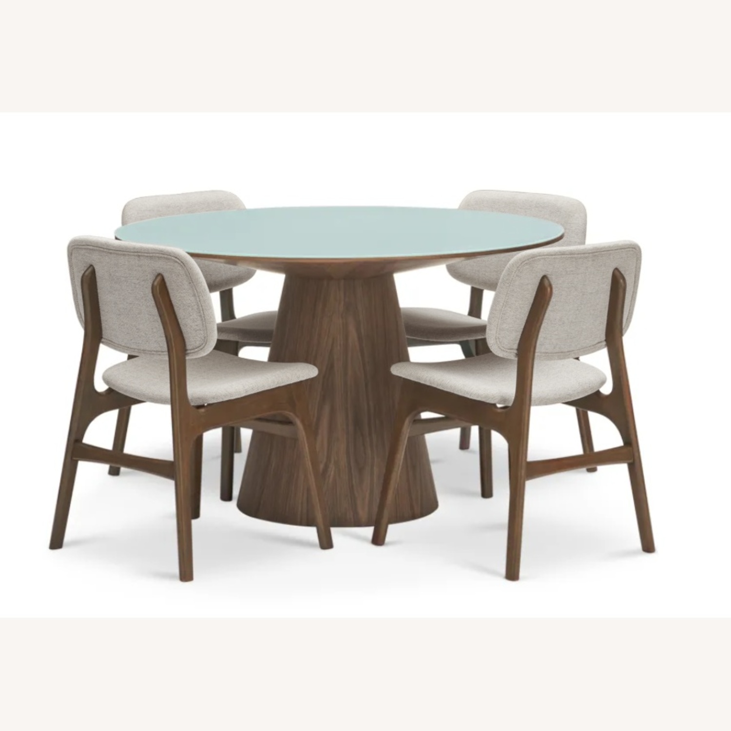 Table: Walnut Veneer with Lacquered White Glass; Chair: Solid Rubber Wood Frame, Foam and Fabric Upholstery
