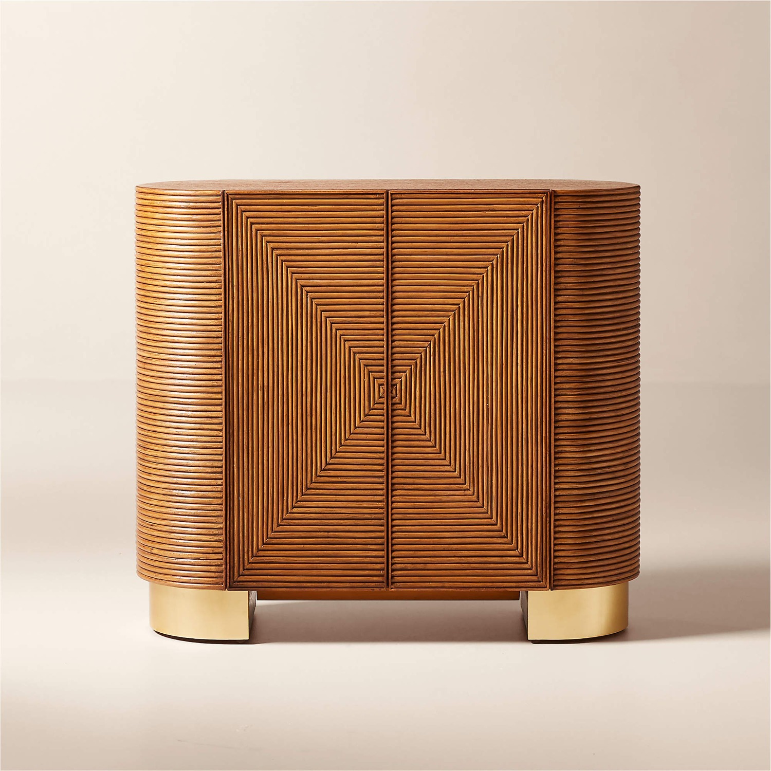 Brett Beldock serves a traditional rattan bar cabinet up with a twist. Solid wood frame with rattan core patterned detail stands modern on a brass half moon base. Inside, shelves hold flat bottomed glasses or flip to store wine bottles in divots. CB2 exclusive.