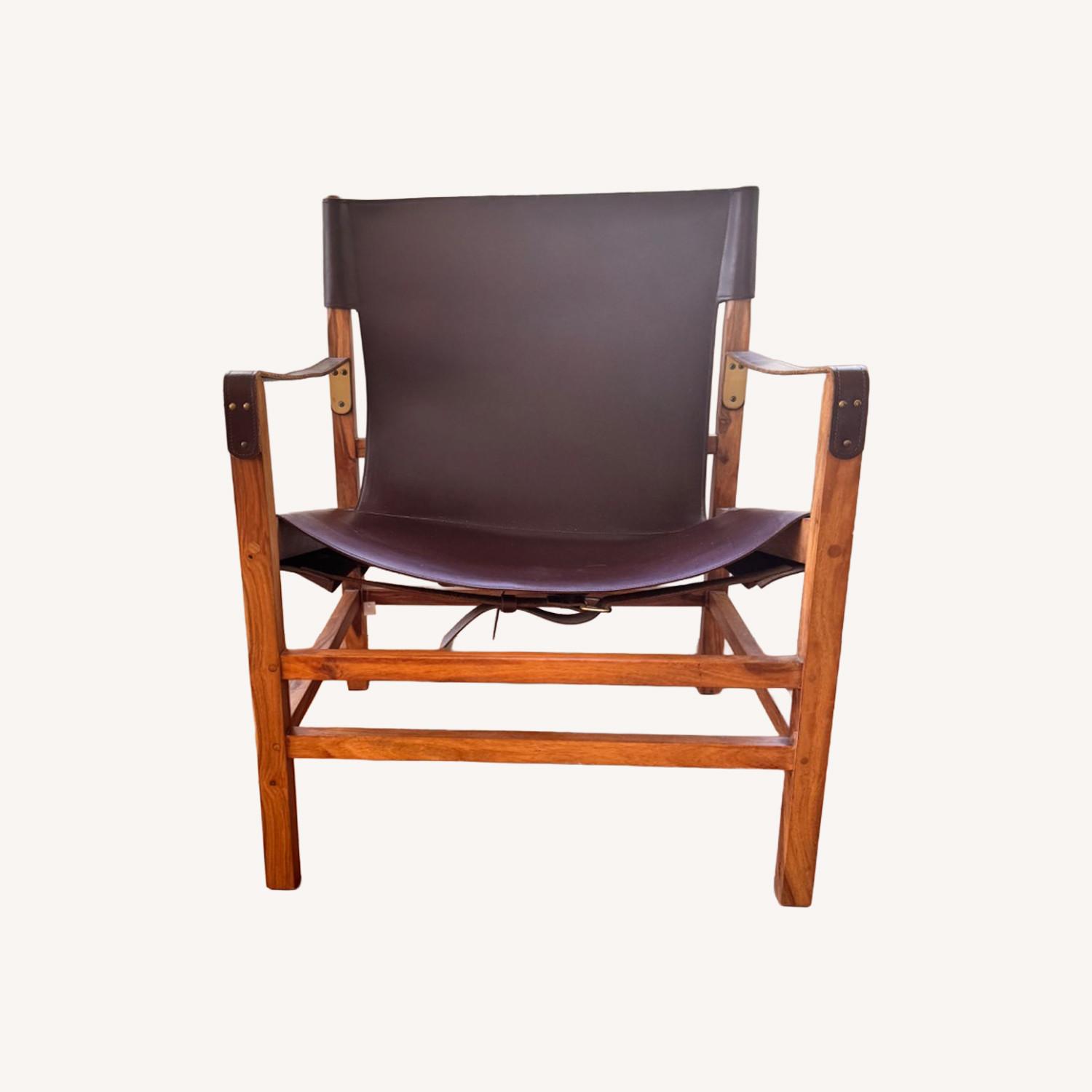 Future heirloom. We tweaked a few design details to get the lines and angles just right. Meet our new and improved interpretation of a vintage safari chair. The kind that goes for a fortune at flea markets. Natural sheesham wood with beautiful grain supports rich chocolate leather seat, back and arm rests. Antiqued brass hardware includes buckles that allow the leather to be tightened as it naturally stretches and patinas over time. Each chair is a unique work of craftsmanship-no two are alike. Place in an eye-catching corner and prepare for compliments. Expat II Leather Safari Chair is a CB2 exclusive. • Sheesham wood with natural lacquer finish • 100% leather seat, back and arm rests • Metal hardware with brass finish • Each will be unique • Leather will patina over time with natural variations in color and markings • Clean with a soft, dry cloth • For indoor use only • Made in India of domestic and imported materials • Made in India