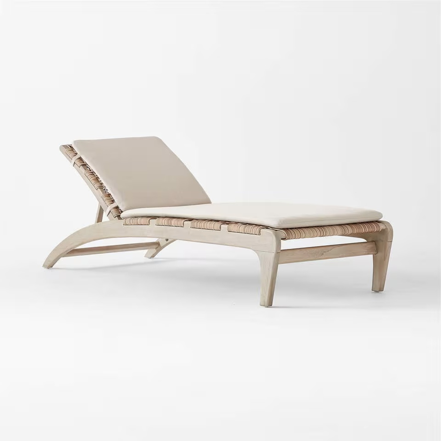 Seller's Notes:CB2 Outdoor chaise lounge for sale. Modern, low profile design. Solid wood frame with a light natural finish. Hand woven rope sides. Neutral beige cushions included. Clean lines. Minimal look. Backrest adjusts for lounging or reading. Comfortable and supportive. Stable and well balanced. Works well by a pool, patio, or garden. Condition. Not used at all. No stains, no marks Frame is sturdy. Very Well maintained. Easy to style with throws or pillows.