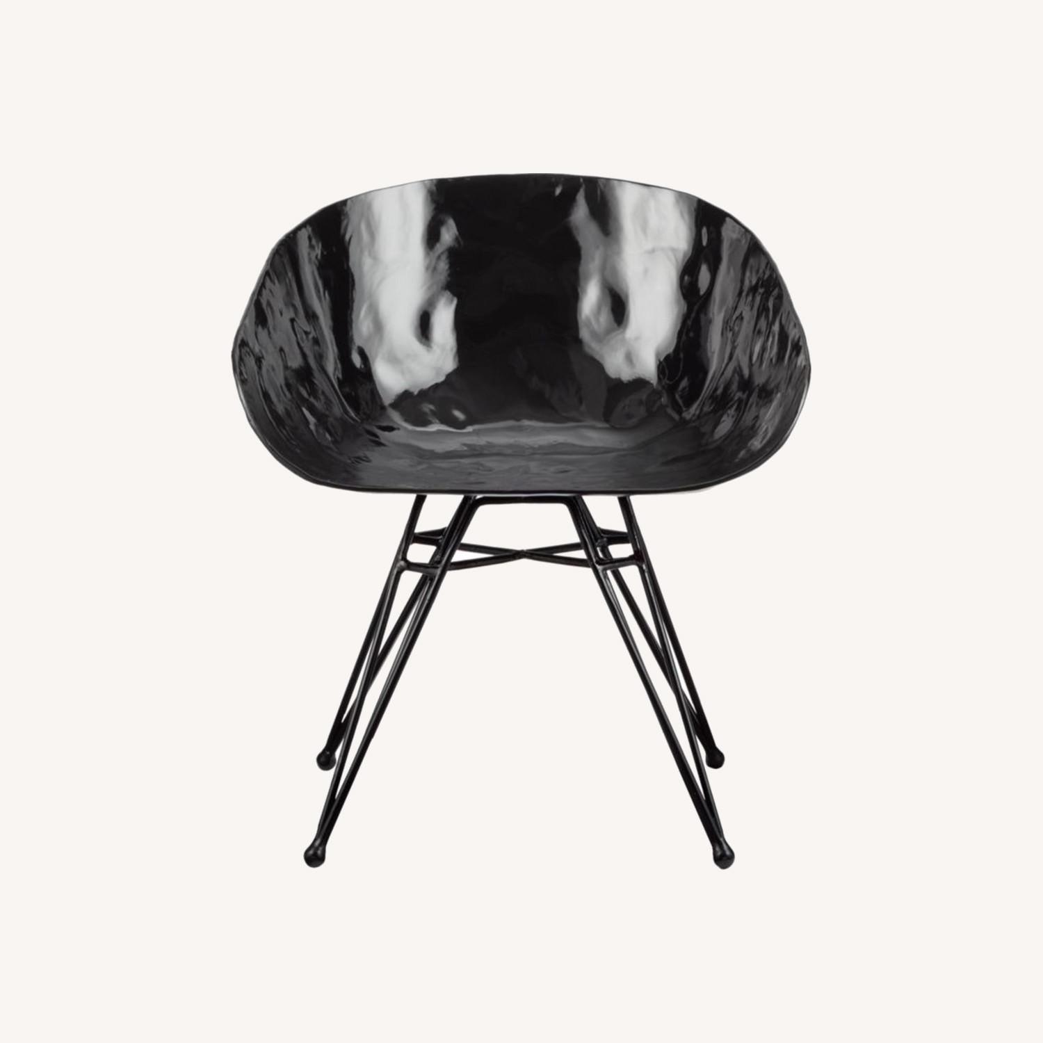 Seller's Notes:Art form. Paying homage to a classic, our avant garde version shows its sculptural side, bringing functional art to the living room. Hi-gloss black metal shell spotlights hand-hammered cratering in back for added texture and depth. Stands sleek alone or pairs with most CB2 seat cushions, like our sheepskin chair pad, for added comfort. Wows as an accent chair, commands attention at the dining table. CB2 exclusive. -Handmade -Metal with hi-gloss black lacquer -Wipe with a soft, damp cloth -Indoor use only -Made in the Philippines