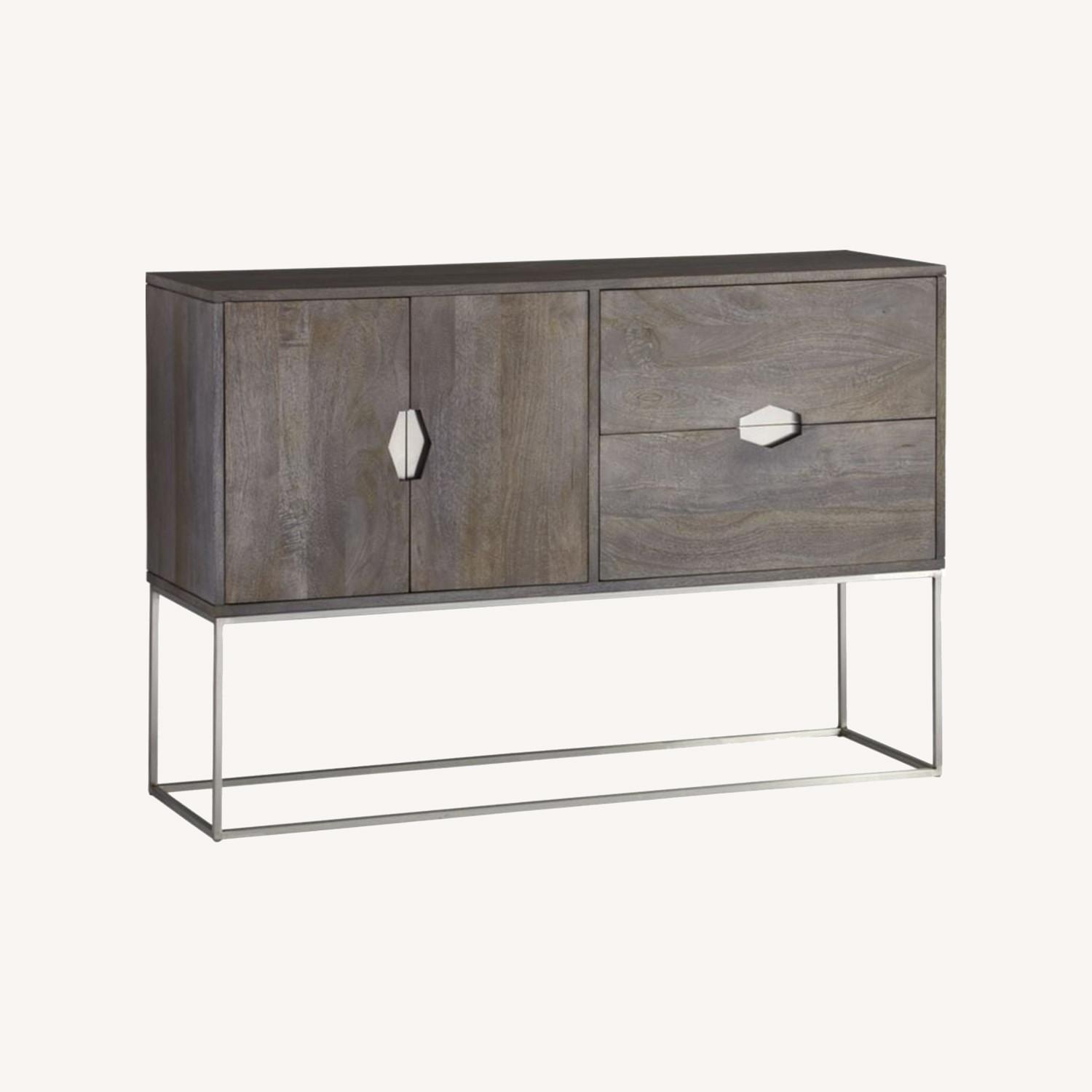 Seller's Notes:opposites attract. Warm, tropical mango wood floats on a sleek frame of brushed stainless steel. Double drawers, double doors and two inner shelves maximize storage in a minimal footprint. Charcoal barely-there lacquer plays beautifully off the brushed stainless steel allowing the graphic cut out design to really shine. A must for the media room. Also excellent in the entry. • Solid mango wood with warm charcoal lacquer • Brushed stainless steel base • Wipe with a soft, dry cloth • Coasters recommended • Made in India