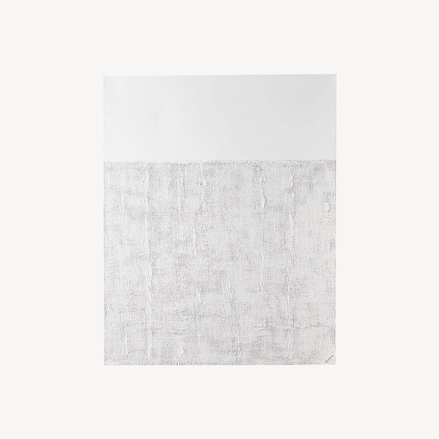 Seller's Notes:bouyght and never actuaklly hunf on wall becasue we never had time. we had to unpack to check the condition of the paintiing and it was intact. "Jute" is an exploration of texture with its use of burlap, gesso and acrylic paint on canvas. Artist Stephane Fontaine cut areas of the burlap's warp and weft to manipulate the weave, capturing raw natural texture. "To me, the piece became a textured, serene, transitional landscape in the end," he explains. Reproduced here to emulate the artist's original techniques. Hangs in two orientations.