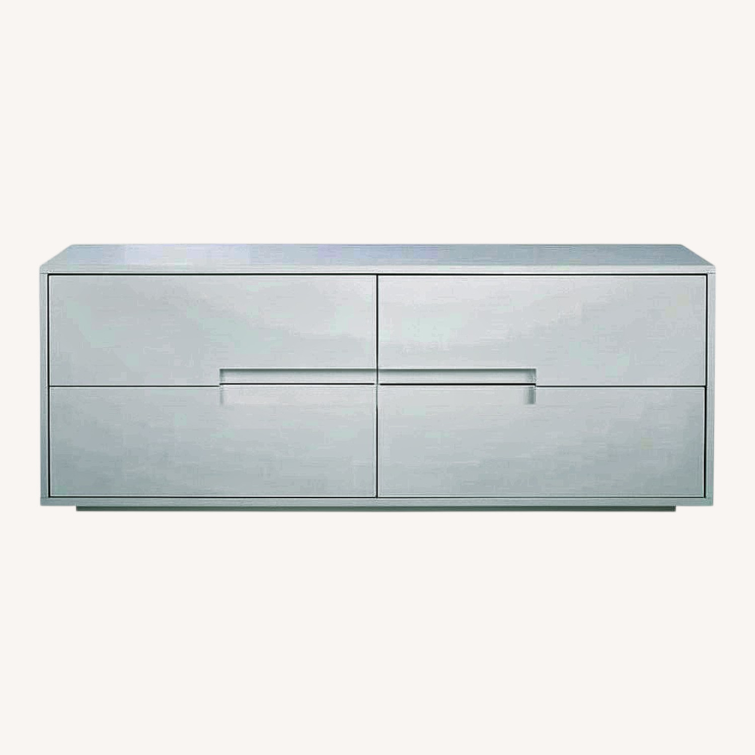 Seller's Notes:four corners. Low, lean and long meets slick hi-gloss white at a four point modern intersection by MASHstudios. Symmetry centers four drawers that pull open sans hardware revealing the inside's all white, too. Engineered wood on solid plinth base with immaculately finished back that can float in the room. A real statement piece. latitude white low dresser is a CB2 exclusive. Designed by MASHstudios Engineered wood on solid wood plinth base Hi-gloss white finish Four drawers have self pulls Back is finished to float in a room Levelers included Made in Vietnam