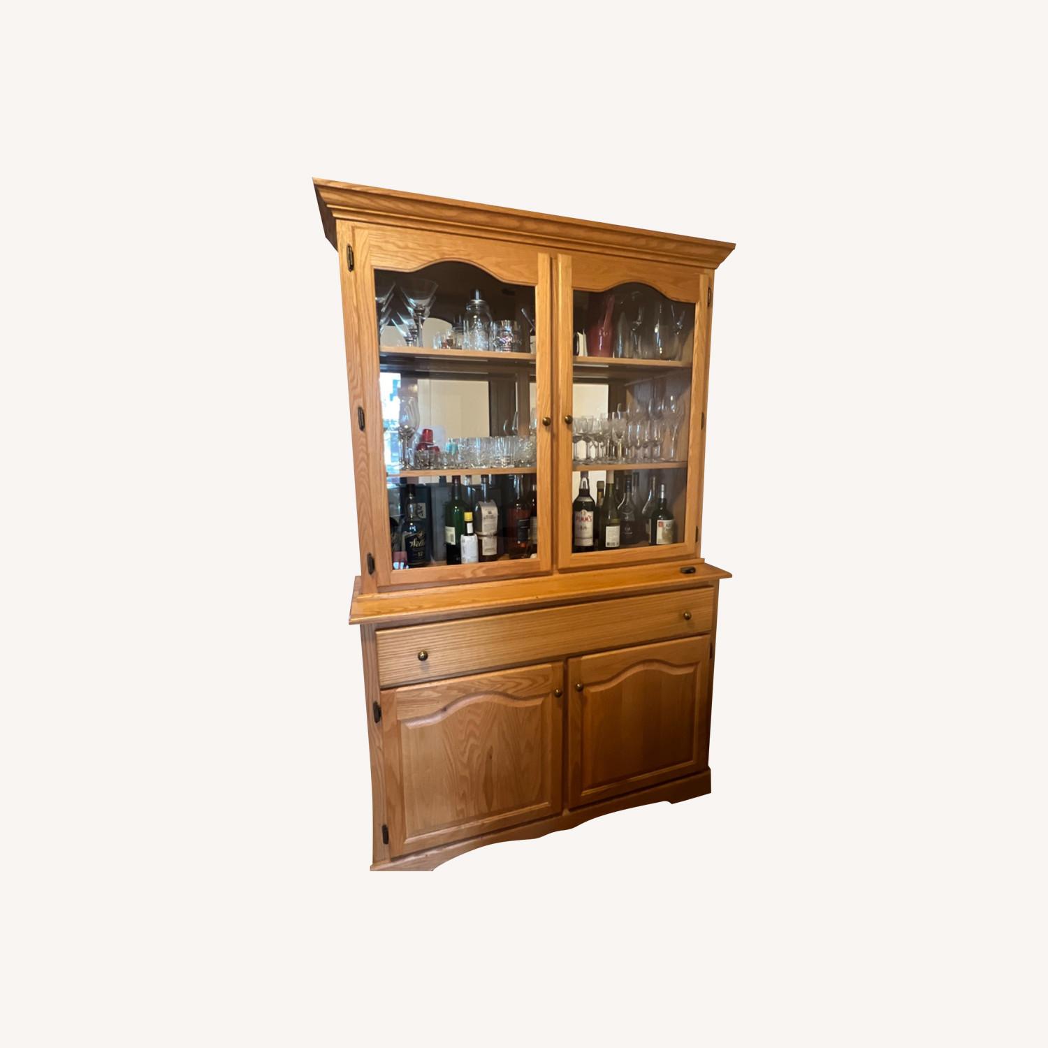 Seller's Notes:Vintage china cabinet, liquor cabinet, storage. Light wood. Wood/glass shelves. One drawer. Two cabinet doors that open and two shelves inside. See photos. 50” wide x 78” tall 18” deep bottom portion, 12” deep top portion. Open to offers. (Liquor and glassware not included lol).