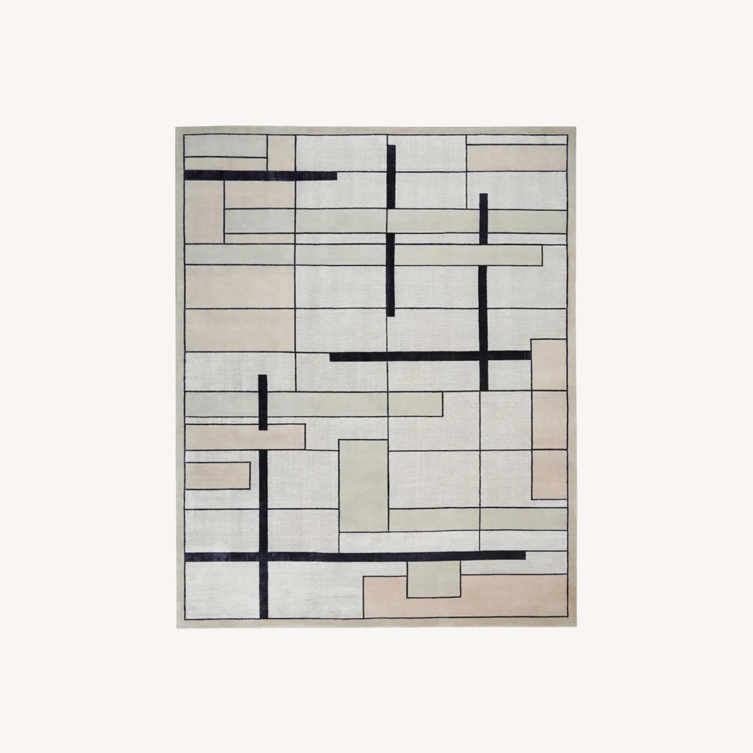 Seller's Notes:Gorgeous hand-woven wool/silk rug in great condition, steeply discounted. Very soft on bare feet, sleek, modern silvery cream with pink and dark gray. A small discoloration from a spill is the only noticeable blemish. Must go ASAP!