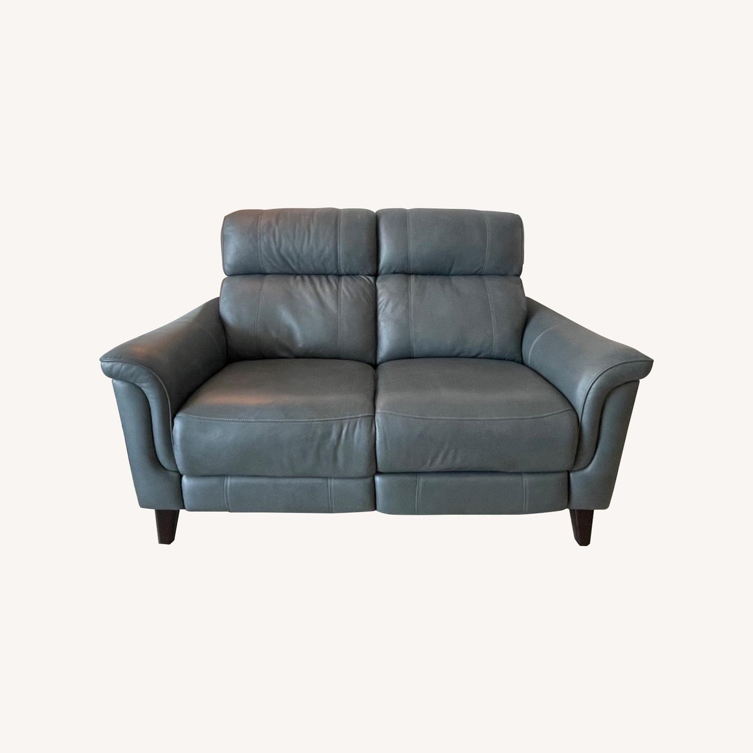 Perfect for smaller spaces or adding to your living room ensemble, the Avezzano loveseat surrounds you in comfort from head to toe. Featuring soft blue top grain leather upholstery where the body touches with coordinating baseball stitching and dual power reclining capabilities that allow you adjust the head and footrests with the touch of a button, this piece is a lesson in luxury. For additional convenience, a USB port is located on one arm of the loveseat. Shaped padded arms and angled tapered wood legs are a chic finishing touch, offering ample midcentury modern appeal. Top grain leather where the body touches and vinyl sides and backs.