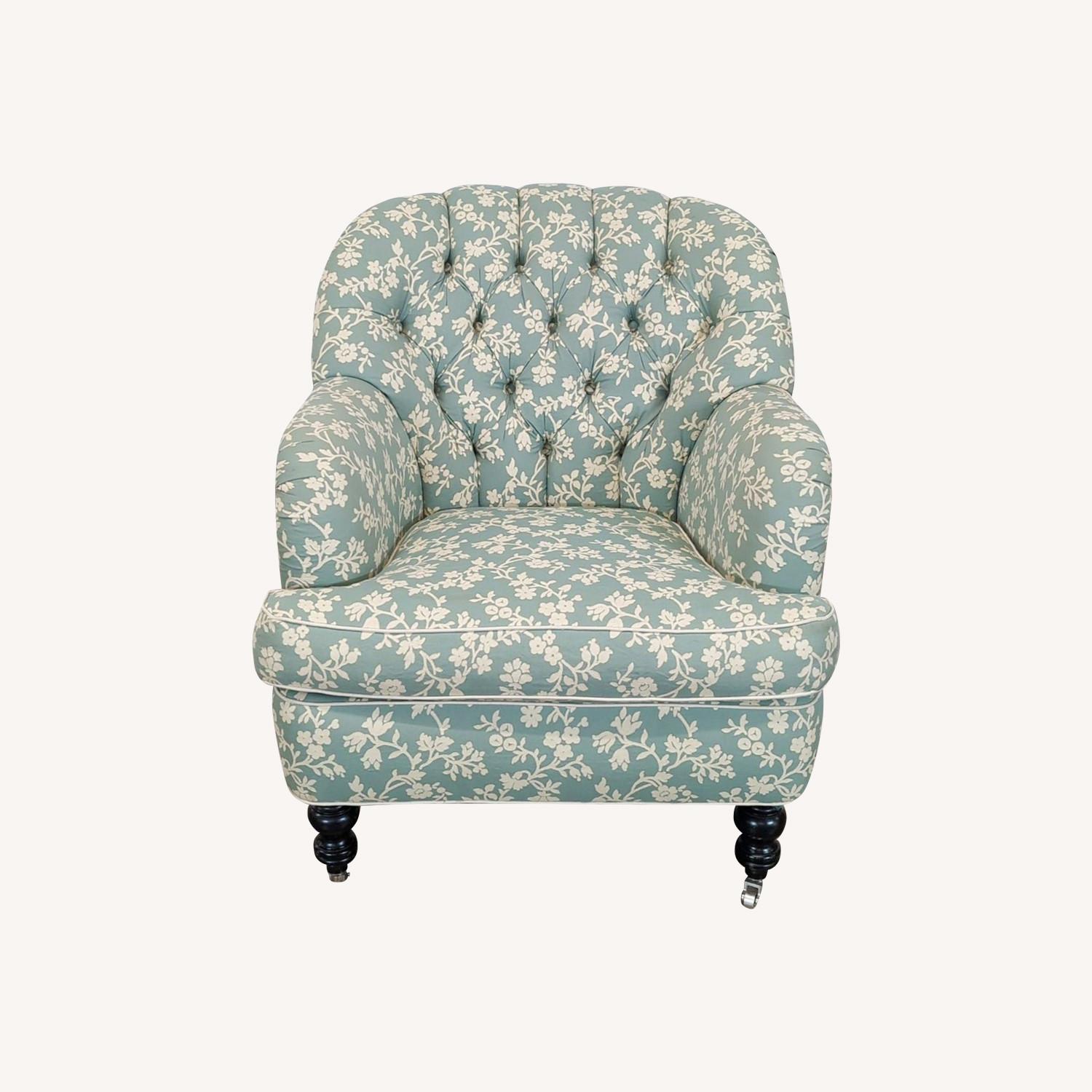 Seller's Notes:Floral upholstery with button tufting and turned wood legs with casters.