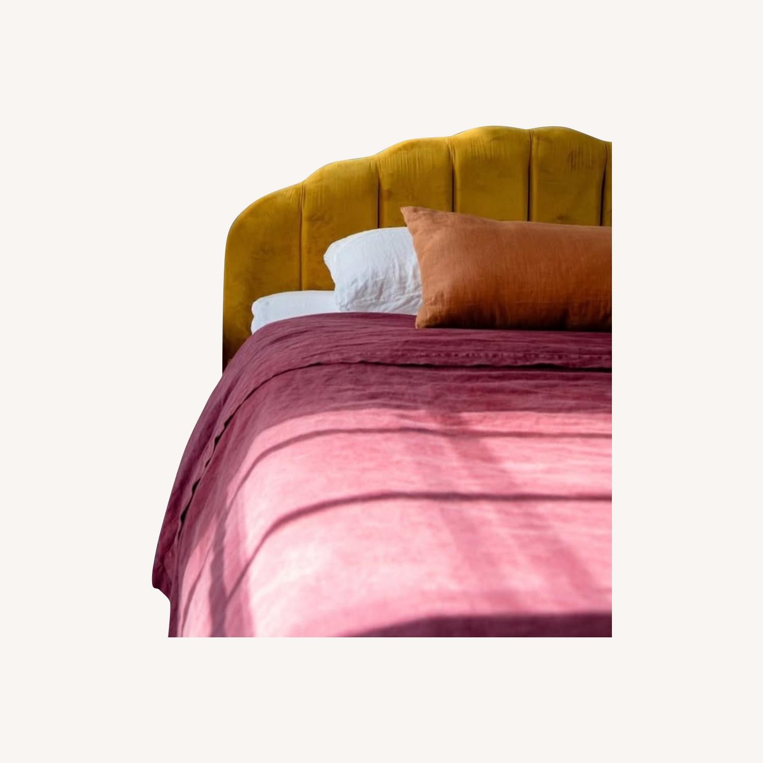 Seller's Notes:Deep yellow / ochre velvet, shell shape, very cute/fun! They don’t make this style anymore, it’s from a few years ago. Shell headboard is like 26 inches high at the lowest on the sides and 38 inches high in the center. Velvet goes all the way around as shown in the screenshot of the other model.