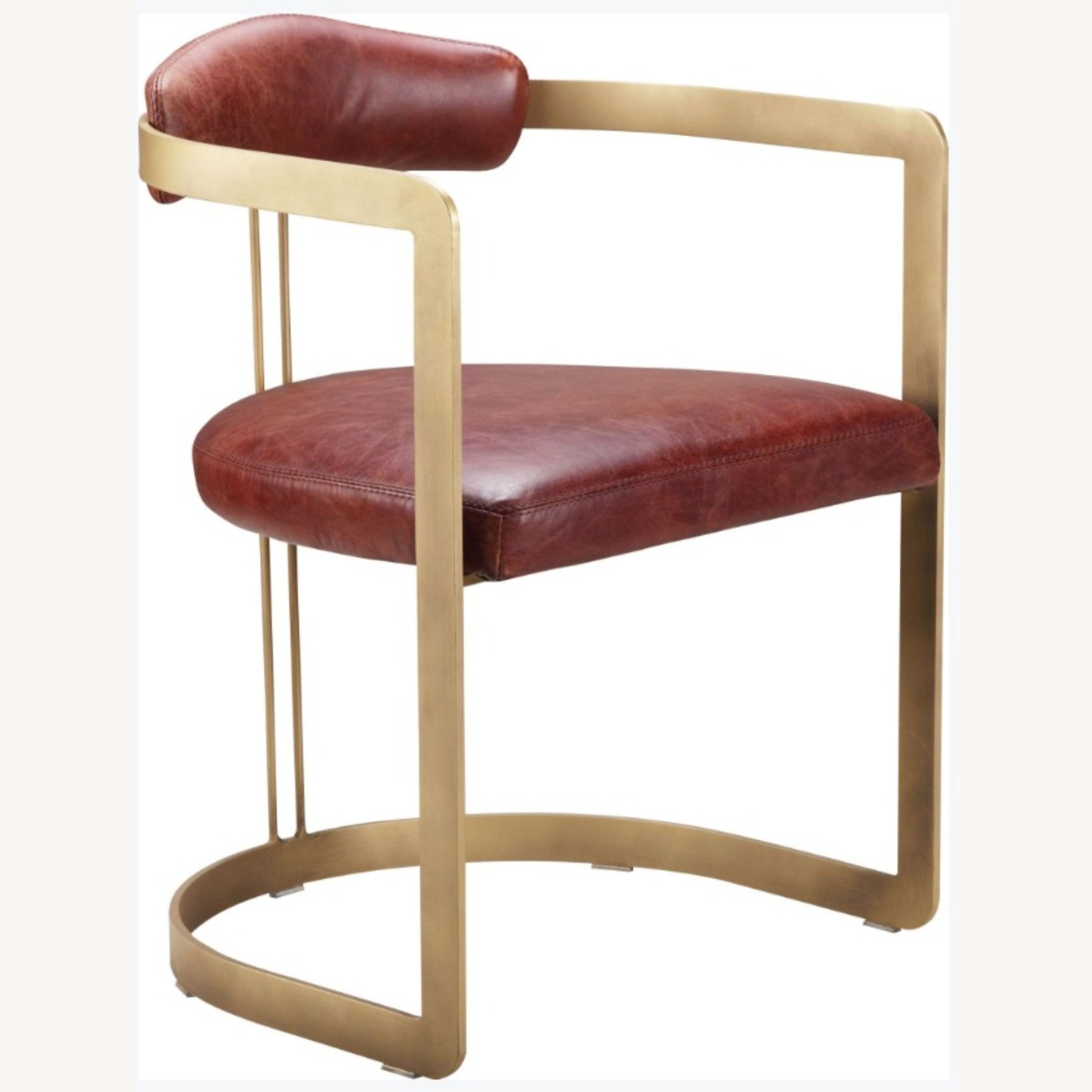 Seller's Notes:Beautiful Antique Coleman Furniture Genuine Leather Accent Arm Chair Bold U-shaped metal frame with an antique brass finish and a curved back that wraps around to form arms. Soft 100% Leather in a warm cherry brown hue. The Antique Brass arms, legs and backing offer a sleek elegant decor addition. Mid-century Modern. In excellent condition and a statement decor piece to elevate a space. Weight: 41 pounds Dimensions: Overall Depth - Front to Back 22.5'' D Seat 17.5'' H X 19.75'' W Back Height - Seat to Top of Back 12'' H Overall Product Weight 41.67 lb. (each chair) *From Pet Free & Smoke Free Home