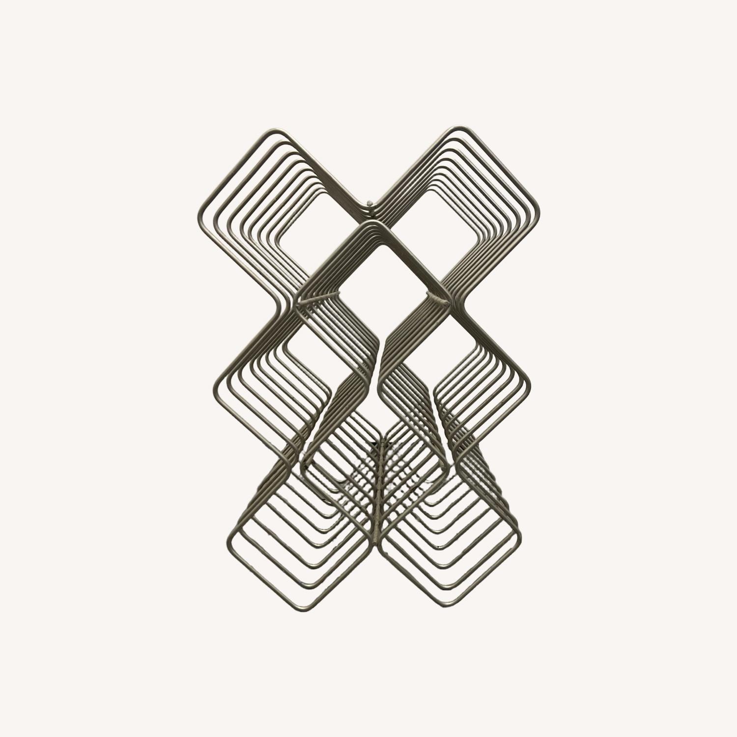 Seller's Notes:Beautiful contemporary chrome wrought iron wine rack. Sturdy. Holds 8 wine bottles. Dimensions: • Width: 10 inches • Height: 15 ½ inches • Depth: 11 inches