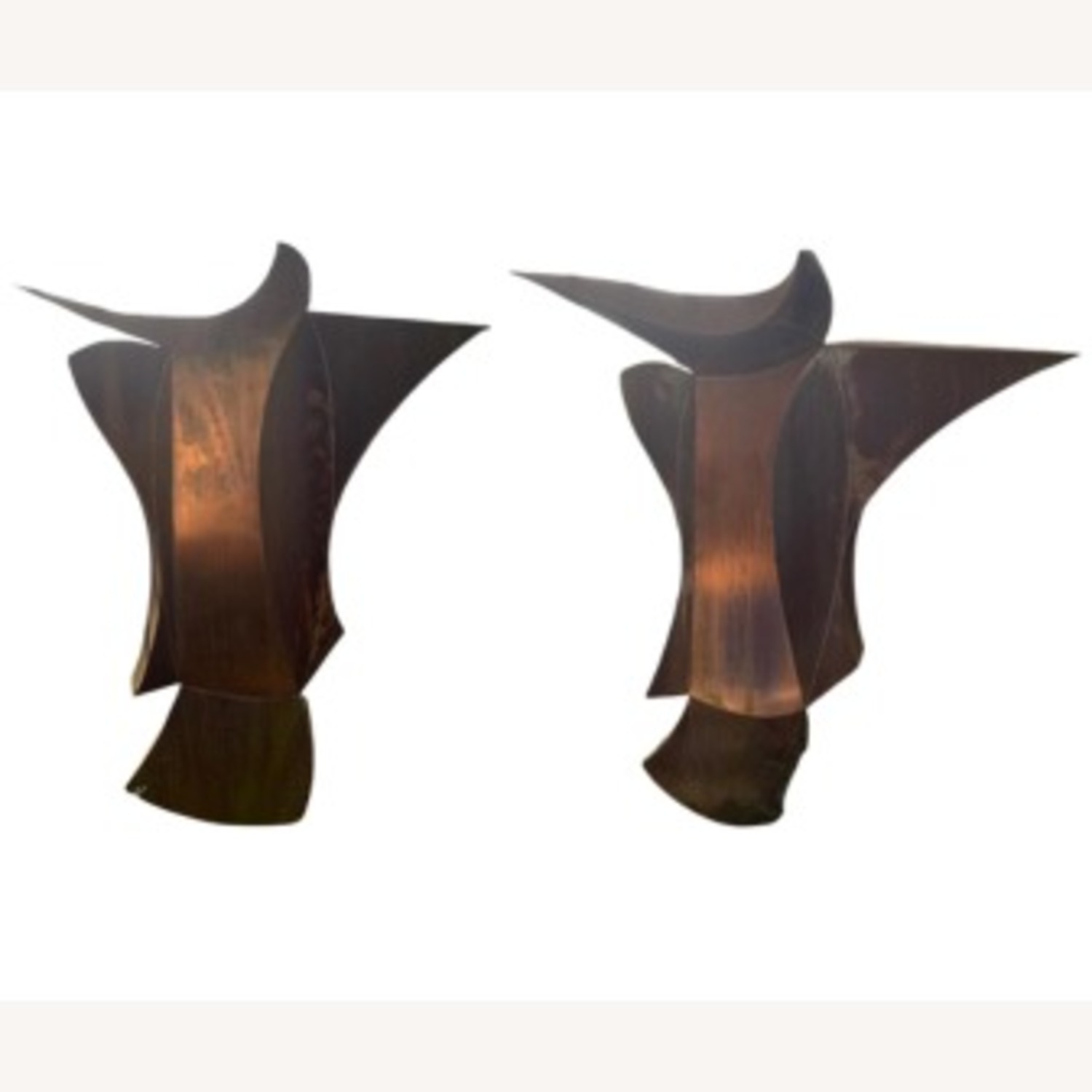 Seller's Notes:Abstract copper sculptures/statues, sold as a set Unknown artist and period made Left sculpture has minor tear as shown in the photos Left sculpture measurements: 74" height 72" wide 9" deep Right sculpture measurements: 69" height 67" wide 14" deep In great condition, normal wear as these are outside sculptures. The sculpture on the left of the photo has a minor "break" as seen in the photos.