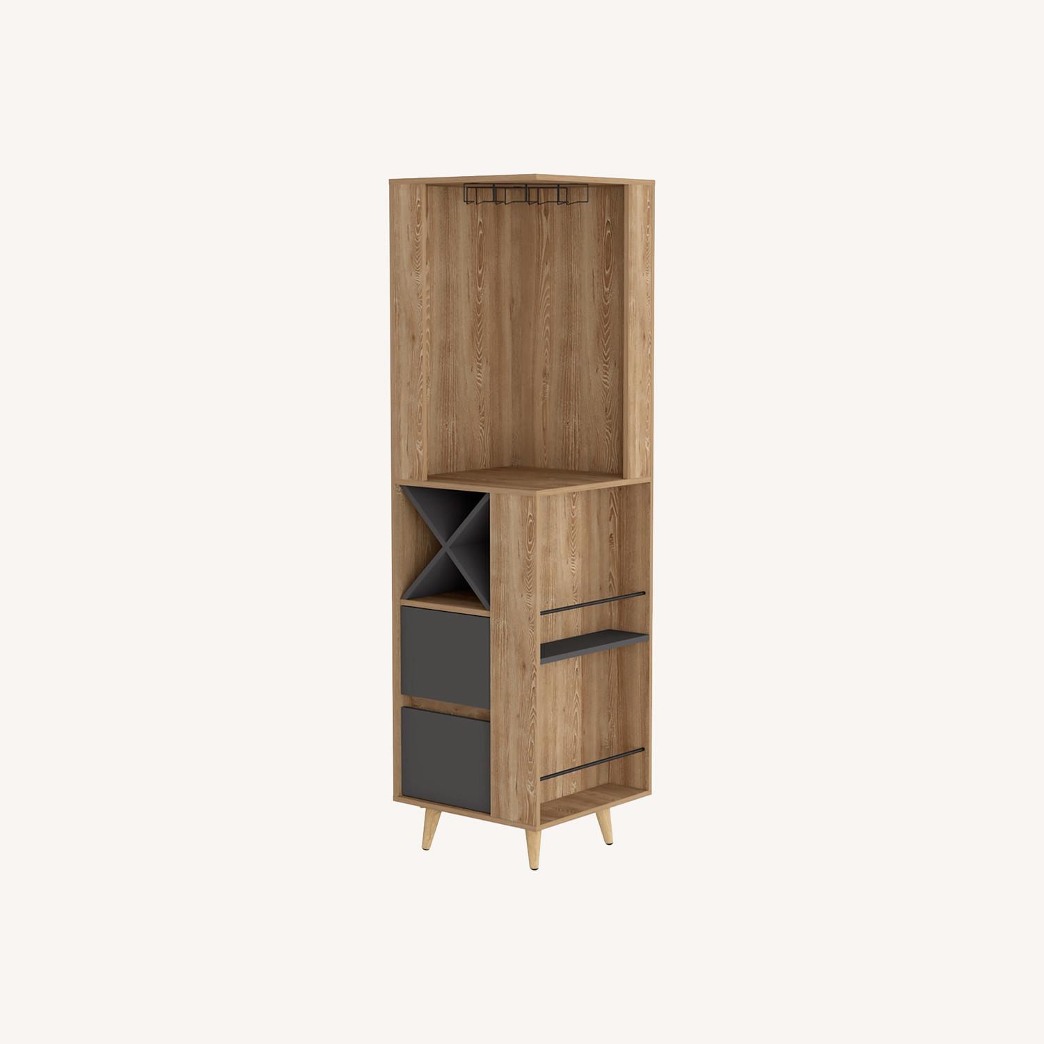 Seller's Notes:"Cataluña Corner Bar Cabinet, do you have a favorite corner? Chances are, it would look even better with this Aubree Corner Bar Cabinet! Not on the cabinet offers excellent storage capacity with a cup rack, two shelves (20''H X 16,5''H X 20,5''W), and one ample flexible drawer, as well as twelve wine cubbies (4,4'‘) making it perfect for any wine lover. Fits perfectly in any corner. Designed with elegant dark brown and light Gray manufactured wood finish. Dimensions: Height: 70,87"" Width: 21,85” Depth: 23,74“ Furniture Type: Ready to assemble (full assembly required).Certifications: CARB phase II compliant – TSCA Title VI Compliant.Warranty: 1-year warranty coverage in wooden parts- 1-year warranty coverage in hardware pieces since its manufacturing date is found in the lot number printed in the product box.Shipment details: Free shipping to the 48 contiguous states - delivery time: Between 2 and 5 days depending on the customer's location, season, and weather factors. Other details: This product does not include decorative or background elements; Check that the box is in good condition, and well packed, and check with the help of the manual that the corresponding parts have been included; For more information regarding warranty, shipment details, cancellations, returns & replacement parts go to the bottom section of our website to learn more; Installation & Assembly Instructions included."