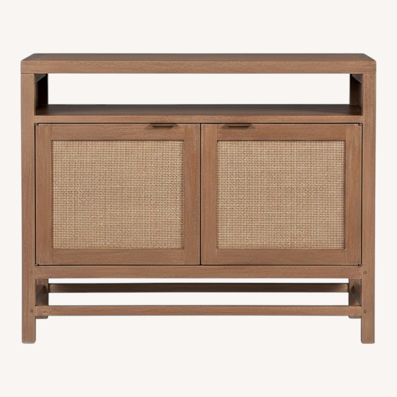 Seller's Notes:Crate & Barrel Blake sideboard in reclaimed wood and rattan. The piece is in good condition with only one watermark as shown on the top left in the photo.