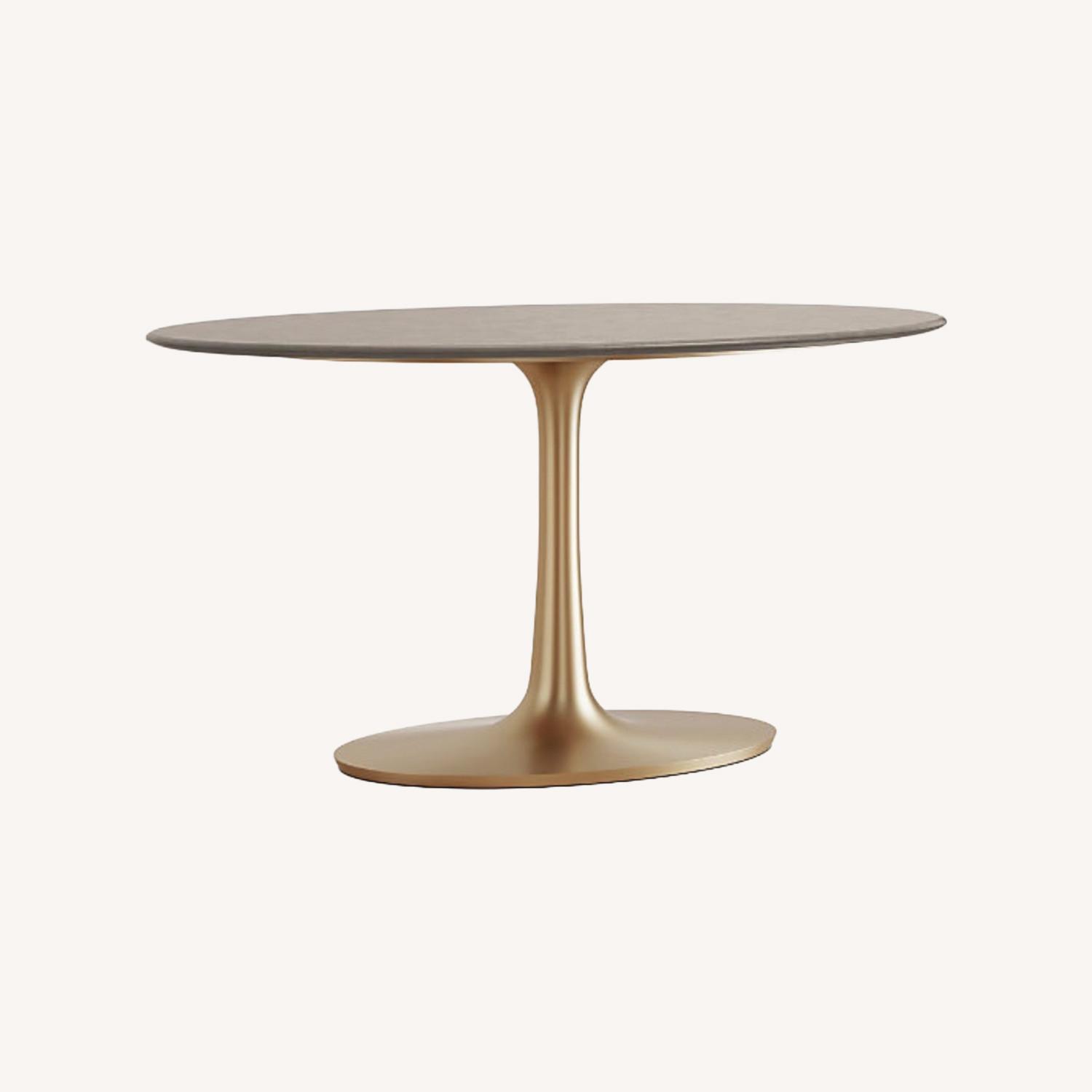 Seller's Notes:Nero curves mid-century modernism in a new direction, mixing metal and concrete in a forward-thinking oval design. An elongated oval of concrete tops a sweeping trumpet base of iron finished in gleaming brass. At once industrial and elegant, Nero seats up to four for brunch, dinner and game night. ^ Each tabletop exhibits its own markings and color nuance inherent to concrete. The Nero oval concrete dining table with brass base is a Crate & Barrel exclusive. Weighted cast aluminum base with brass powdercoat finishConcrete top with protective coatingResin, PVC and glass-reinforced concrete on bottom of tabletopWater spots, pinholes, and color swirls are a natural component of the cement curing processSeats up to 4For indoor useUse coasters and placemats to protect surfaceWipe with damp clothWipe top lightly with quality furniture wax periodically to clean and protect finish