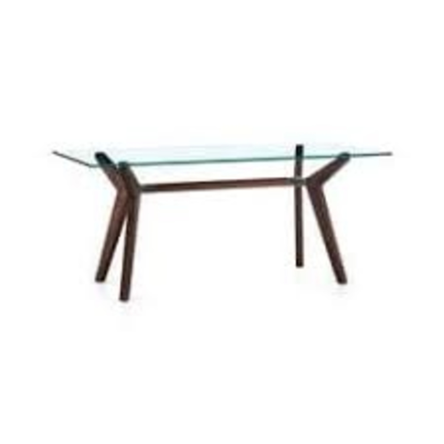 Seller's Notes:The statement-making Strut table offers clean, modern lines for the home office or dining room. A substantial glass top floats on dramatically-angled hardwood legs with a warm matte bourbon brown stain. ^ A crossbar support connects at the legs with unexpected steel joints. Striking from every angle, the versatile Strut can fit up to six as a dining table. The Strut Bourbon 70" Work Table is a Crate and Barrel Exclusive. Hardwood with bourbon brown stain, water based lacquer and wax topcoat As with all solid woods, expansion and contraction may occur with seasonal changes in humidity 5/8" glass top Steel joints Seats six Made in India