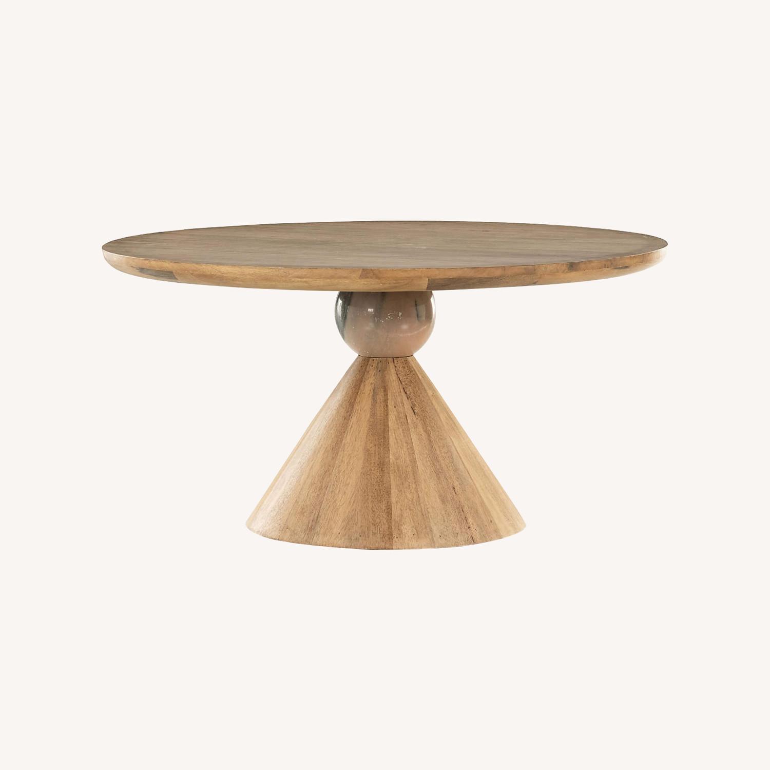 Seller's Notes:A sculptural showstopper, our Foxx dining table balances bold geometric shapes and a modern mix of materials in perfect proportion. Finished in smoked honey, solid parawood fashions the dramatic cone-shaped base and round top with reverse beveling. In between, a ball of marble adds a gleam of blush and unique veining. Contemporary and elegant, the Foxx wood and marble dining table seats six. Foxx 60" Round Natural Wood Dining Table30.5"Hheight60"Wwidth60"DdepthMeasurements are in inches. Solid parawood top and base with smoked honey finish Marble detailing with blush finish Seats up to 6 Levelers included Due to the characteristics of natural wood and marble, color, grain and veining will vary Made in India