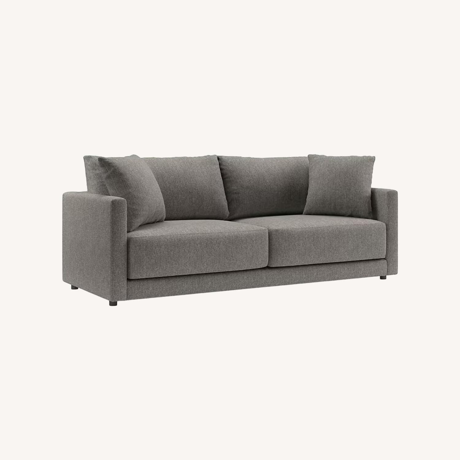 Seller's Notes:Everyone's invited to Gather. Clean-lined and current, our Gather petite apartment sofa strikes the perfect balance between comfort and modern style. Scaled for smaller living spaces, the apartment-sized sofa breaks new ground with a thin deck that puts all the focus on its boxy, extra-plush seat cushions that sit comfy but not too deep. ^ Trim top-stitching and seamless armrests keep the look neat, not fussy. An exclusive Crate and Barrel design, the Gather petite apartment sofa is made with engineered wood certified by the Forest Stewardship Council (FSC), the environmental gold standard for responsibly managed forests.