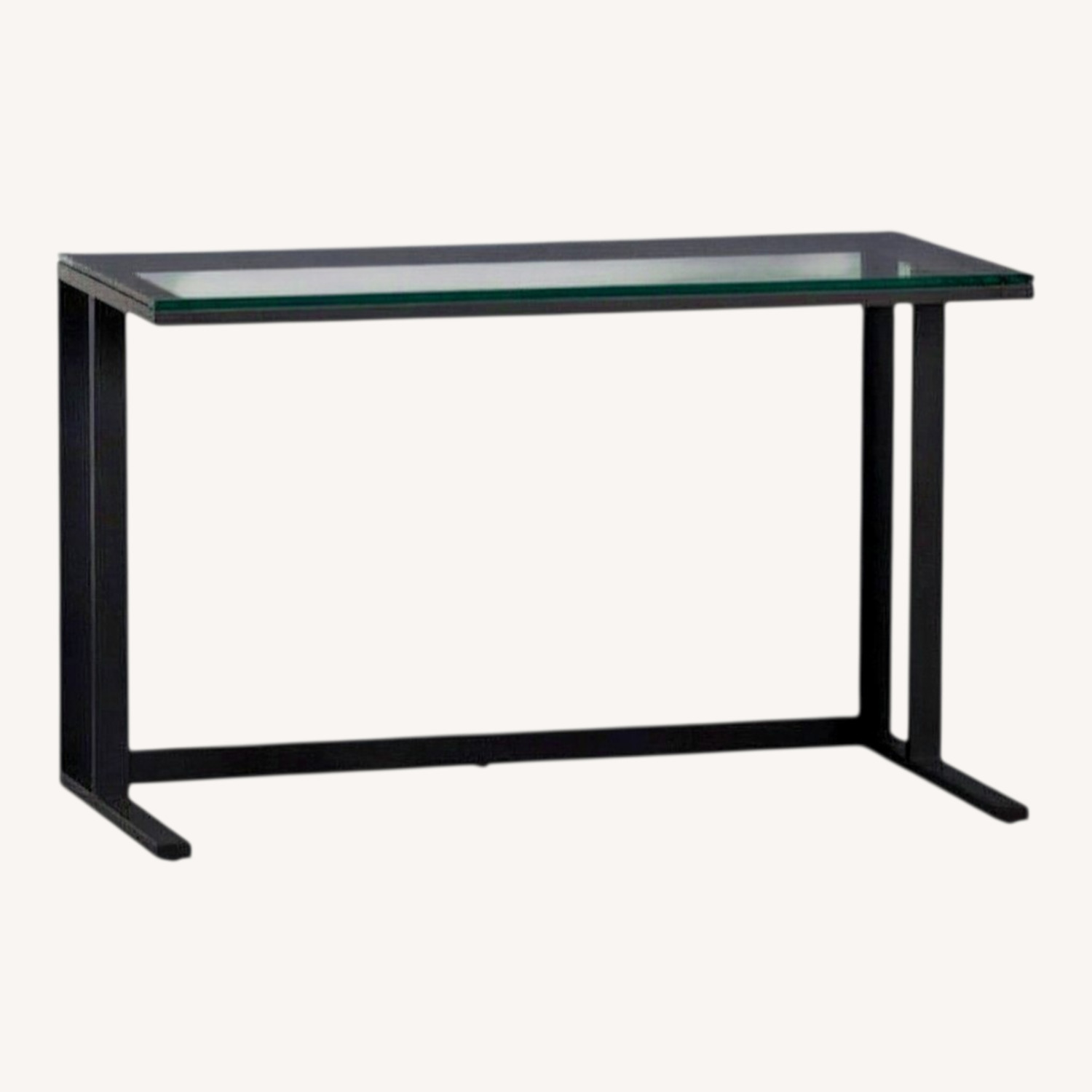 Defined by its industrial mix of glass and steel with modern angles, Pilsen is an architectural collection with an urban edge at a smart value. Finished in matte grey powdercoat, this desk's glass surface floats over a minimalist frame of rectangular iron tubing. ^ Designed by Mark Daniel, this piece offers versatile style against a wall or suspended in a room's center. The Pilsen Graphite Glass Desk is a Crate and Barrel exclusive.