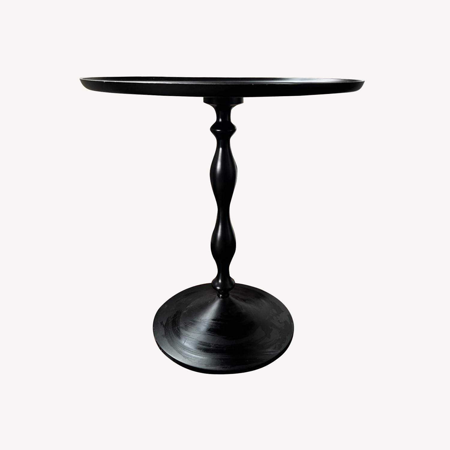 Seller's Notes:Black metal spool accent pedestal table. 25" height x 23" diameter. A few scratches around the edges and one scratch in the middle. Otherwise still very useable and stylish.