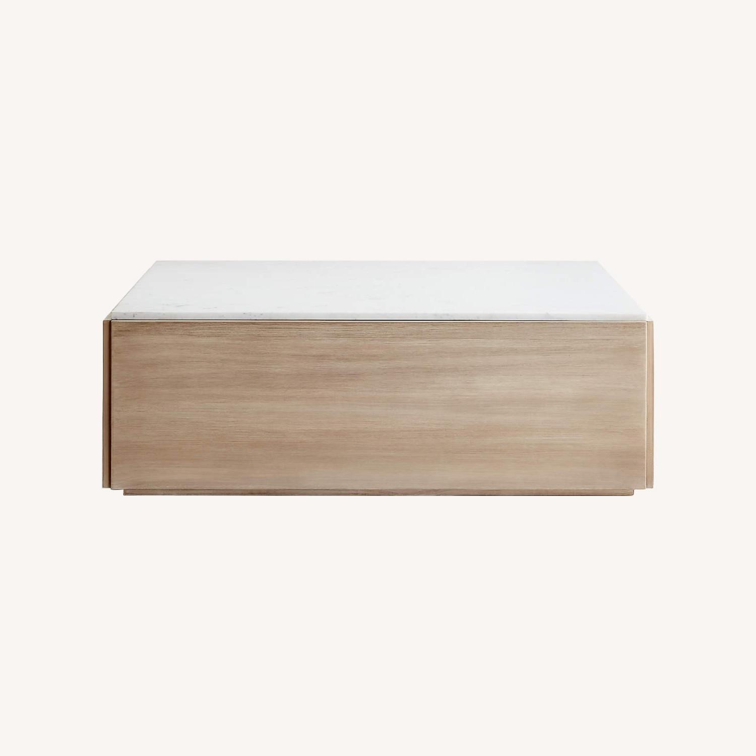 More meets the eye in Troupe's deceptively simple box-like design. Full of woodworking details in sustainably sourced pine, the square coffee table features flat-paneled sides that meet in bird-beak joints, bringing dimension and vertical interest to all four corners. Composed of quarter-sawn planks of pine veneer, the panels showcase linear graining that's enhanced with wirebrushing and a glazed finish. A top of honed white Banswara marble pairs naturally with the wood's light, warm color, and a recessed plinth base lets our exclusive coffee table float in a room.