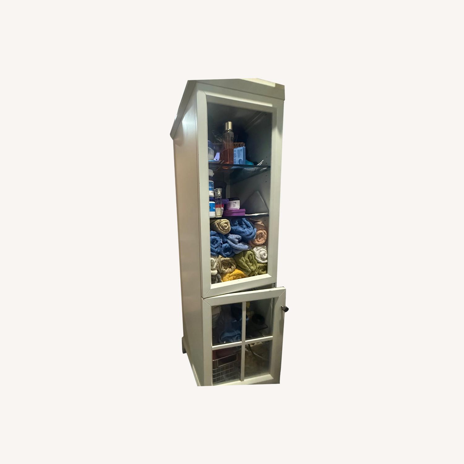 Seller's Notes:Originally purchased from crate and barrel. Comes with 3 glass shelves (glass door), 4 metal baskets