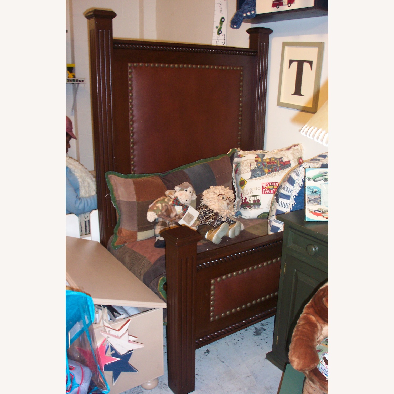 Seller's Notes:Another fabulous deal on a piece from our beautiful custom furniture collection. This twin size bed is made of 100% hard wood. The upholstered panels are a high-quality faux leather, allowing for easy wipe-off cleaning. Bed is shown in a dark wood finish with intentional distressing throughout, creating a rich, naturally aged look and feel. Headboard is 64" to top of posts, footboard is 30"H to top of posts. Bed is sold as-is. Has been used as a floor model and has a few markings throughout accordingly. If you have any questions, please contact us directly.