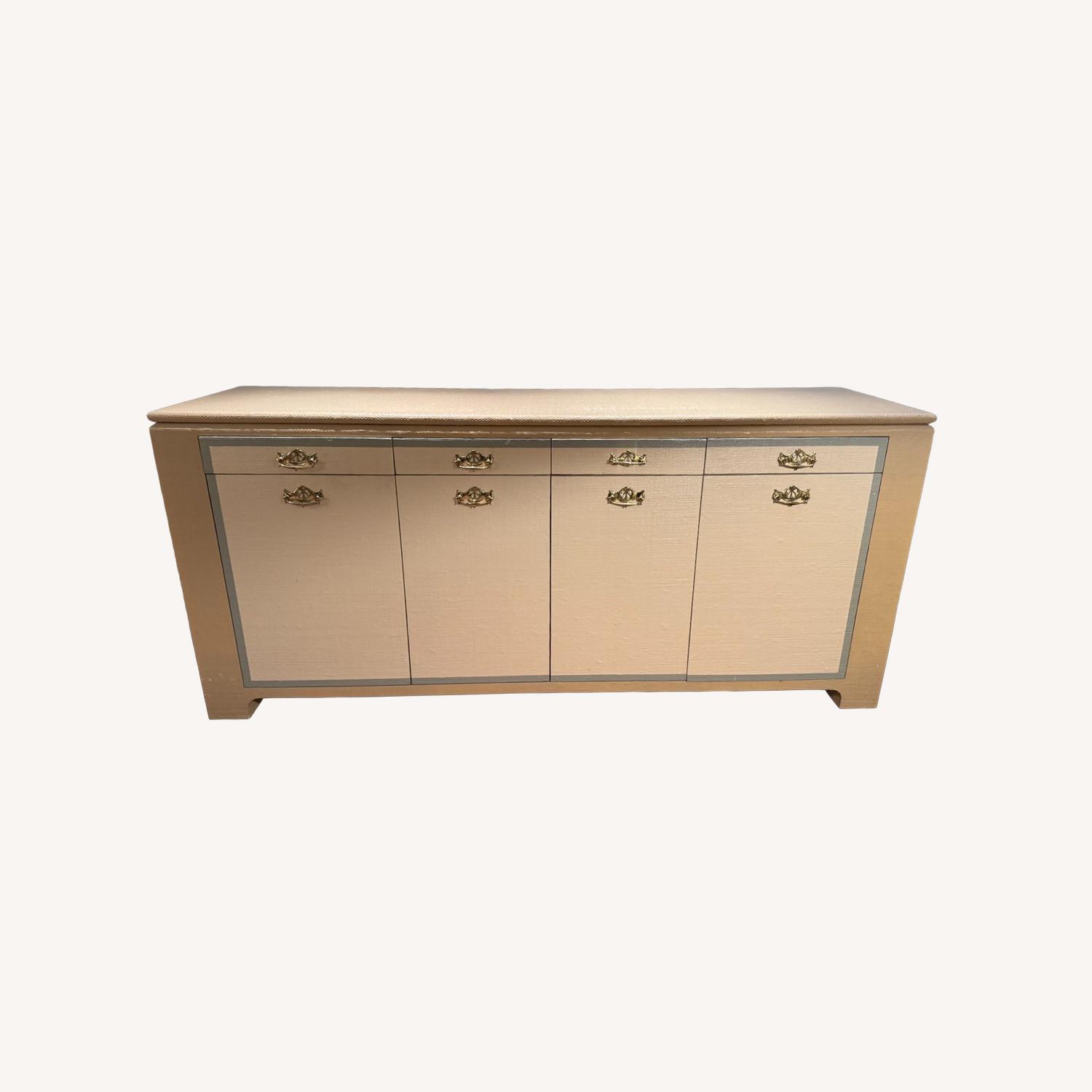 Seller's Notes:Custom Made Linen wrapped solid wood Buffet with lots of storage including cabinet for wine fridge, metal lined ice drawer and pull out drawers. Great storage.