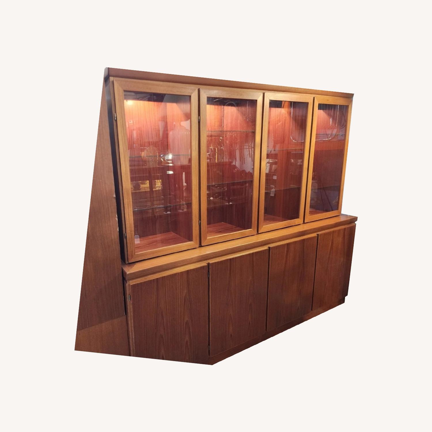 Seller's Notes:Danish modern by Scovby. 2-piece teak buffet /hutch. four door panels lower sideboard.. plenty of storage with side pull out drawers lined with green felt fabric. Lighted display upper hutch with glass shelves For your favorite collectibles in any room. It can be Separated to create the sideboard stand alone T.V. Dresser Look.. and the floating style glass cace On hairpin legs.. Fantastic vintage condition,