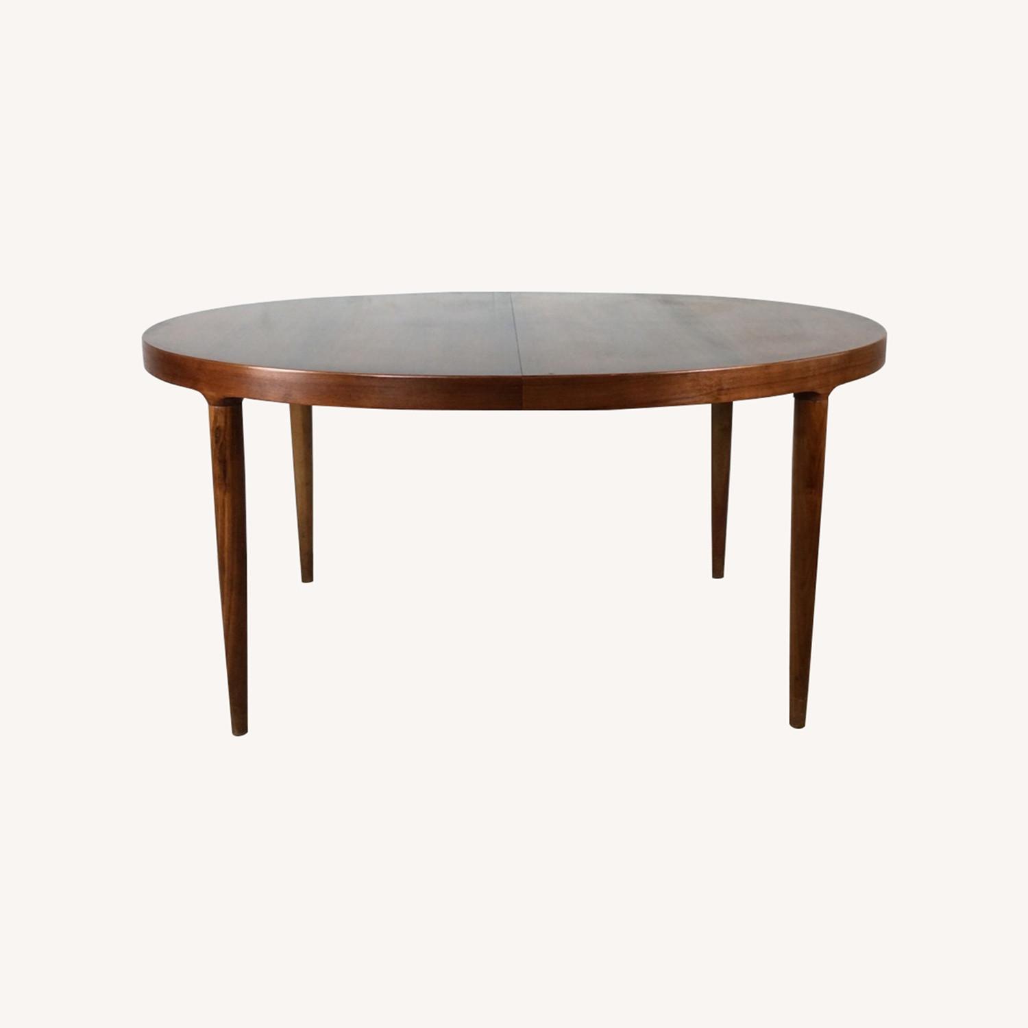 Seller's Notes:This Danish modern dining table features hardwood construction, original teak finish, unique oval design with three leafs for added length, and tall tapered legs. Overall length with 3 leafs in is 137.75 Each leaf measures 26.25 inches Dimensions: 59w 43.25d 29.5h Condition notes: Original teak finish is in excellent condition with only minor scuffs, slight small scratches, scuffs. There is some discoloration between the wood top and the 3 leafs indicating that the original table finish may have faded with age. Not super noticeable but worth noting. 9/10