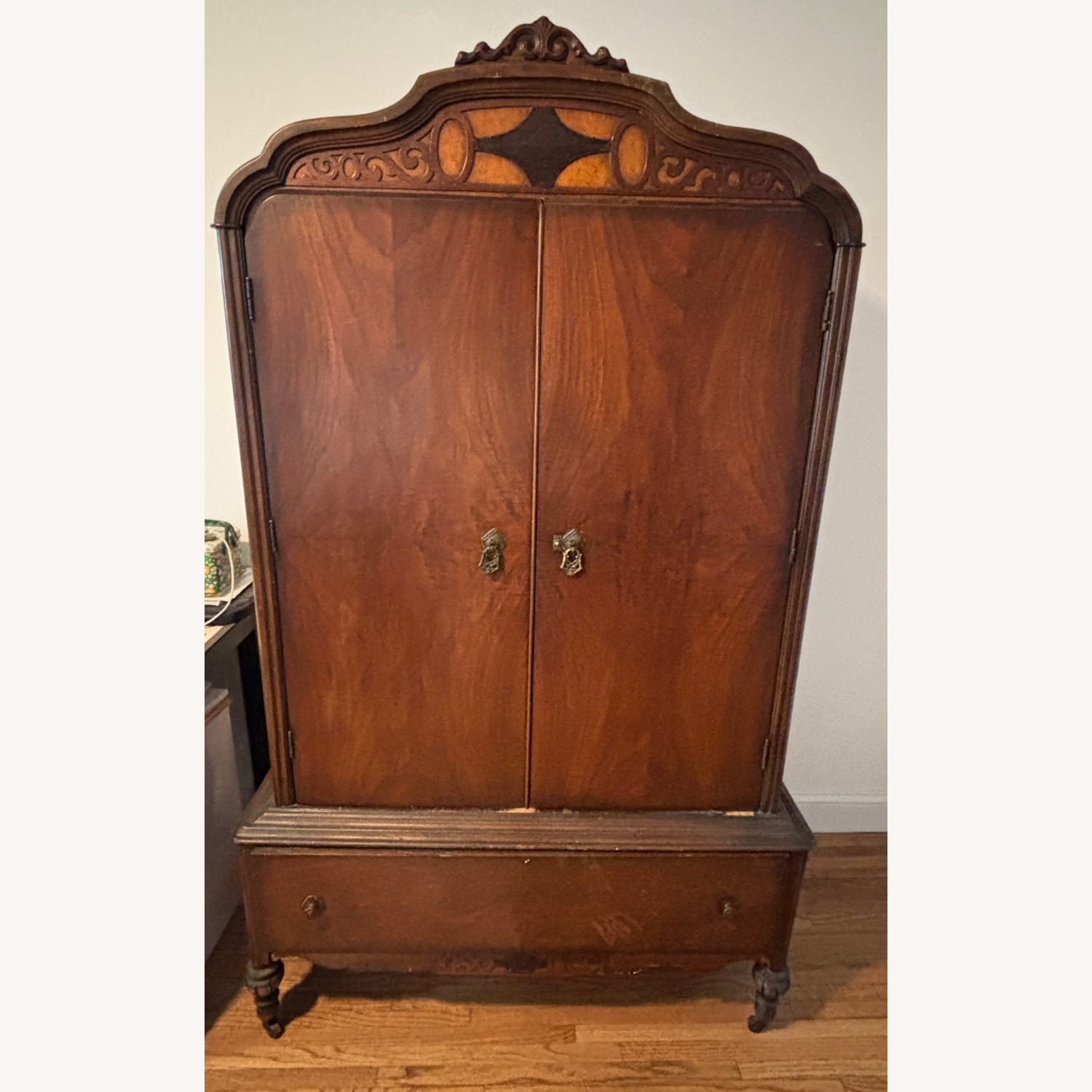 Seller's Notes:This is a vintage armoire that belonged to my grandmother. It is pressed wood, but has lovely wood inlay detail at the top. It has some scratches, as it's lived a long time! It has 3 interior drawers, another (larger one) at the bottom, and interior room to hang clothing. We no longer have room in our home for it - but it would make a wonderful addition to a bedroom OR a really cool bar (with a little imagination).