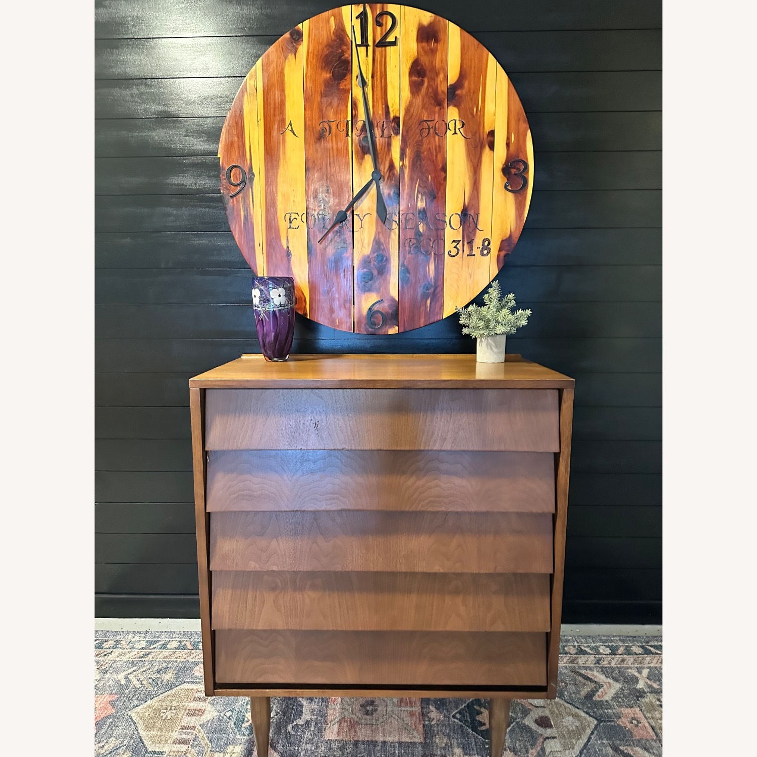 Seller's Notes: Gorgeous Ward MCM dresser featuring clean architectural lines, smooth oversized drawer fronts, and classic tapered legs. This piece has been refinished to highlight the warm walnut-tone grain and give it a sleek, modern look while preserving its authentic mid-century style. * Authentic Ward Mid-Century Modern design * Beautifully refinished wood throughout * Five smooth, spacious drawers * Solid, sturdy construction * Perfect as a bedroom dresser, entryway statement piece, or stylish storage Hard to find a Ward MCM piece in this condition—timeless, functional, and ready for its next home. Dimensions: Height: 41 Depth: 18 Width: 34