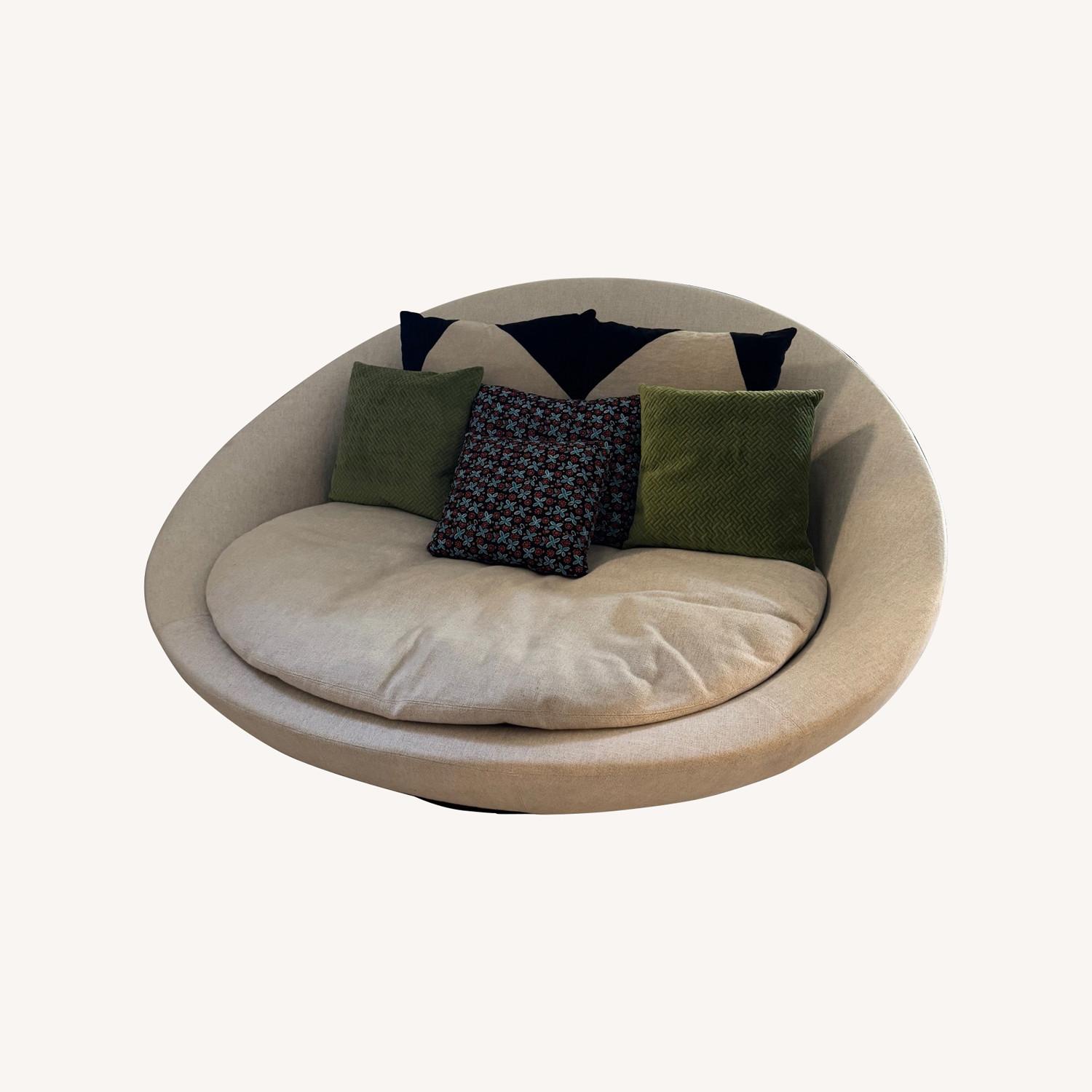 This is the famous “Lacoon Island”, round sofa. An enveloping, soft and fun-loving swivel island, made for exquisite relaxation. Designed by Jai Jalan and built in Italy by Desiree. Each refined, comfortable product with its distinctive design is genuinely unique. Every detail is there for a reason and is manufactured with skillful care. This sofa is in very good condition and only a few years old. It is super comfortable and comes from a luxury apartment. I’m very sad to be selling it…