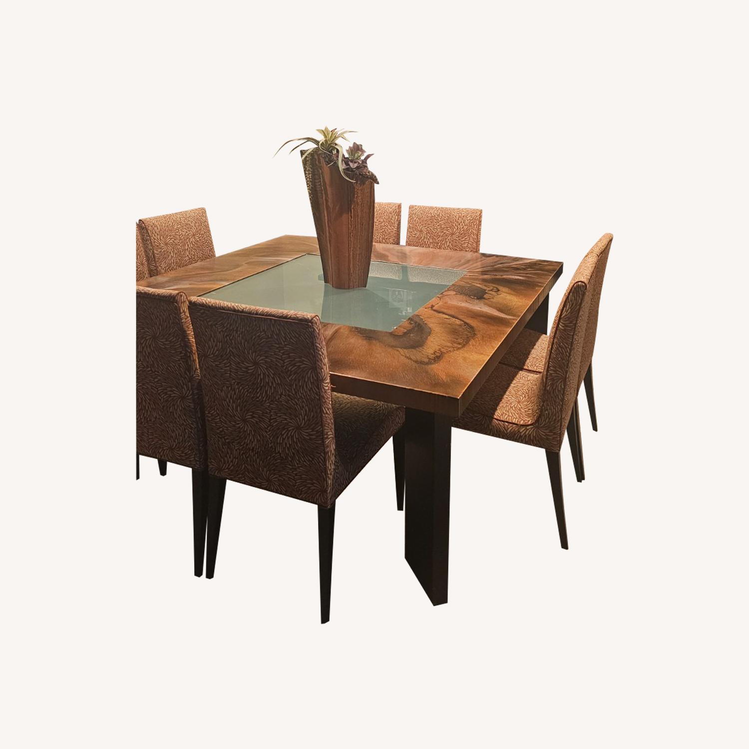 Seller's Notes:Substansial 66x66 table with 8 chairs. Custom poured epoxy finish. Server with modern shelving. Beautiful wooden vase included. Note: These items are very heavy.