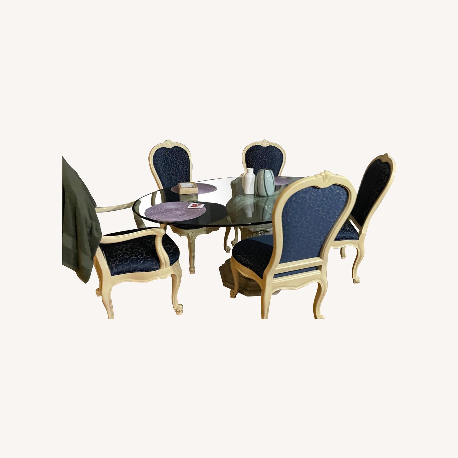 Seller's Notes:Glass dining table with 6-7 chairs Pretty heavy table, don’t know exact dimensions