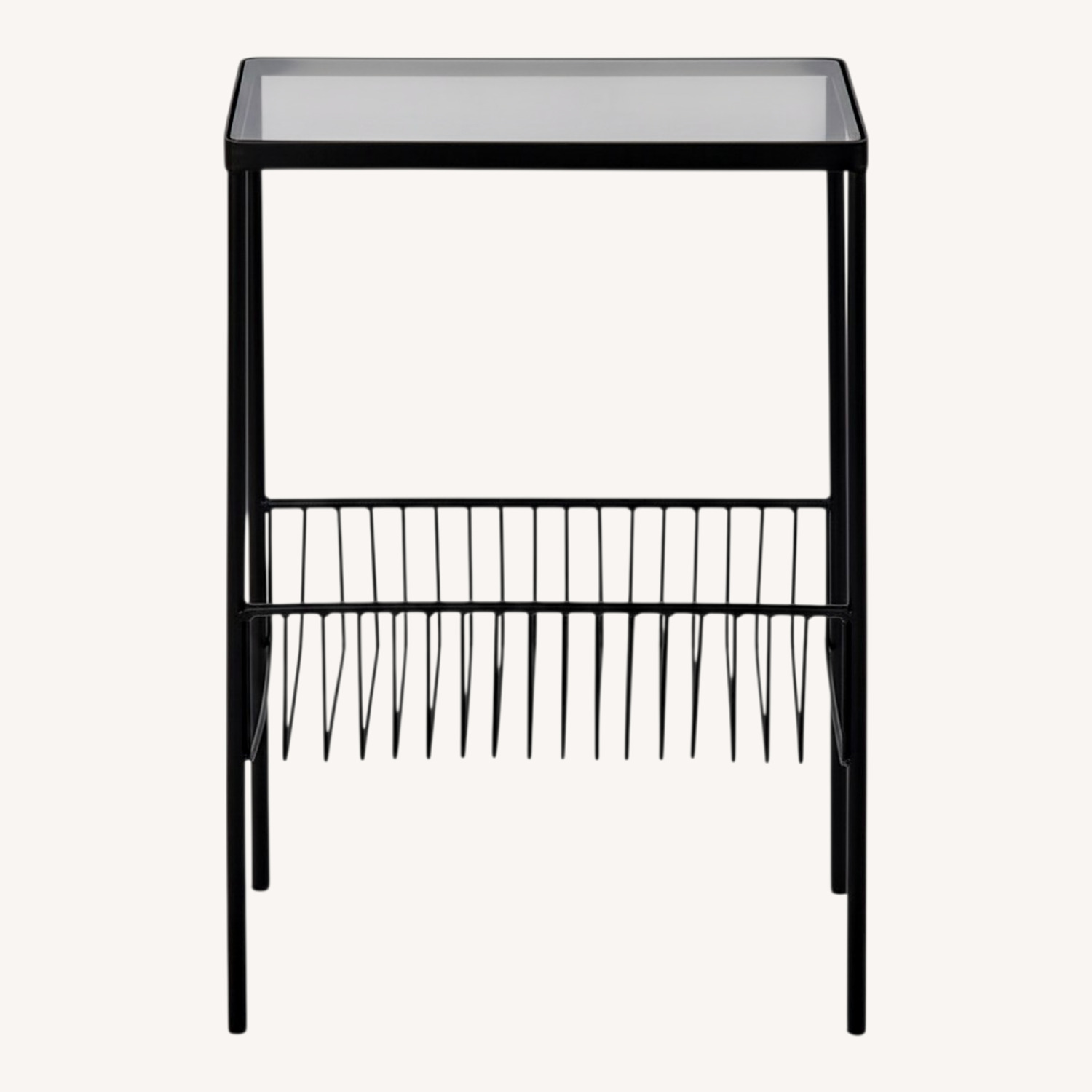 Seller's Notes:This end table combines modern sophistication with pure practicality, featuring a sleek, tinted glass top and a convenient bottom storage rack. Use it to store your favorite novels, magazines, and tablets, and reduce the clutter in your home. With its smaller stature and simple design, it fits perfectly between the living room couches or next to the loveseat. It's not exclusively made for the living room, however; use it as a minimalist nightstand in your bedroom, or as a place to store mail in your entryway. The matte black powder coat finish also makes this side table resistant to natural wear. With its clean, black look and modern style, this product blends seamlessly with any contemporary decor. And with its padded feet, you can move this table around the room without the risk of scuffing your beautiful floors. With its gorgeous minimalistic design and useful functionality, it will be the perfect place to set your morning coffee or store your favorite reading materials.