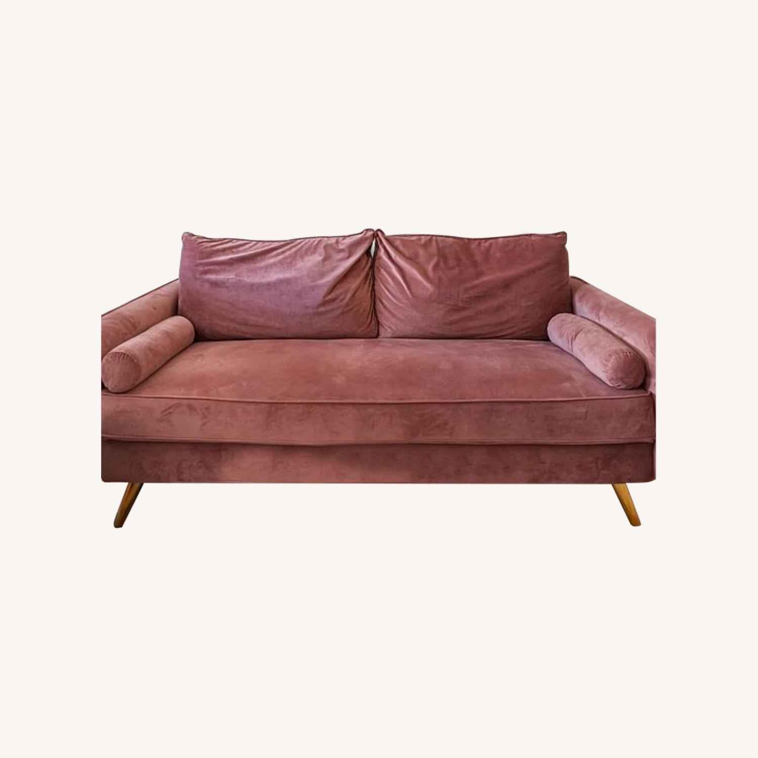 Seller's Notes:Dusty rose velvet sofa purchased in a boutique furniture store in NYC. Midcentury modern design with gold legs. Sofa is in great condition!