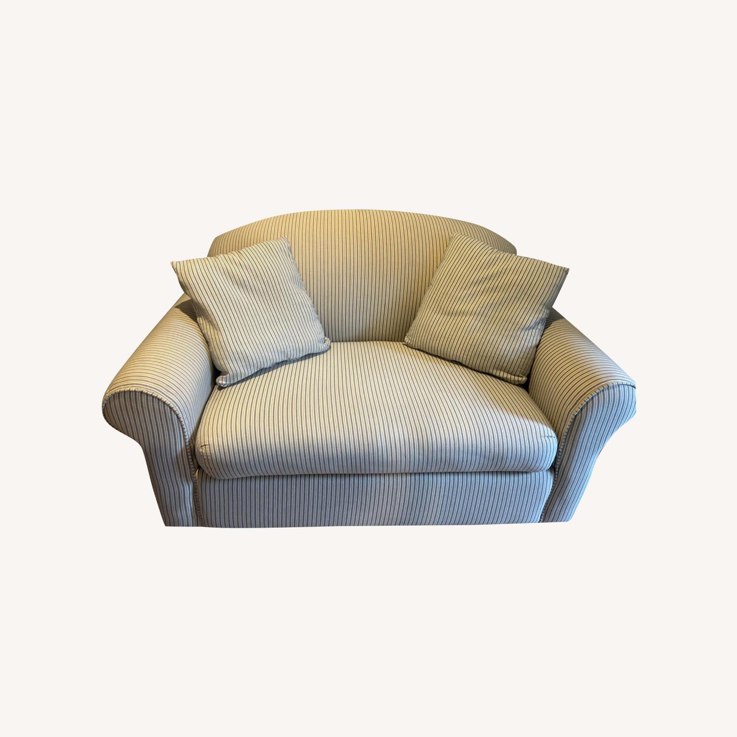Seller's Notes:This piece is in nearly new condition and has been stored in an unused guest bedroom since it was purchased. Very comfortable cushion! Seats two for a cozy hang. The base color is yellow with thick blue and delicate green pinstripes.
