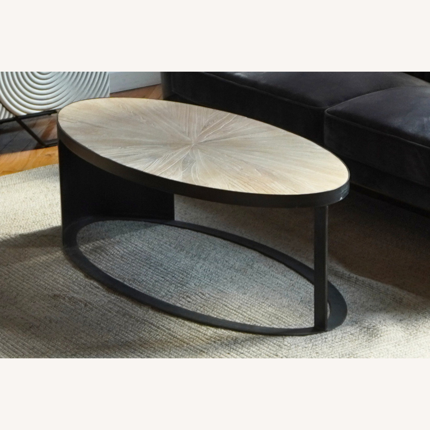 Seller's Notes:Ellipse coffee table is the perfect centerpiece for your modern living room or office. A warm birch inspired white pine table top features a gorgeous concentric design, and solid steel industrial base provides adds an industrial flare to the centerpiece. The rounded shape pairs well with curved sofas such as Monroe, and our living room sets. Ellipse coffee table is round with a wood top and modernist steel base - a simple but unique centerpiece. An off white table top features a gorgeous concentric oval design, and solid steel grey base adds a modern industrial flare. The muted tones and minimalist design is perfect for a monochromatic living room or colorful modern living room. The asymmetrical design makes it visually alluring from all angles, and elliptical shape is perfect for a curved sofa like Monroe., and our mid-century modern credenzas. Ellipse coffee table is round with a wood top and modernist steel base - a simple but unique centerpiece.
