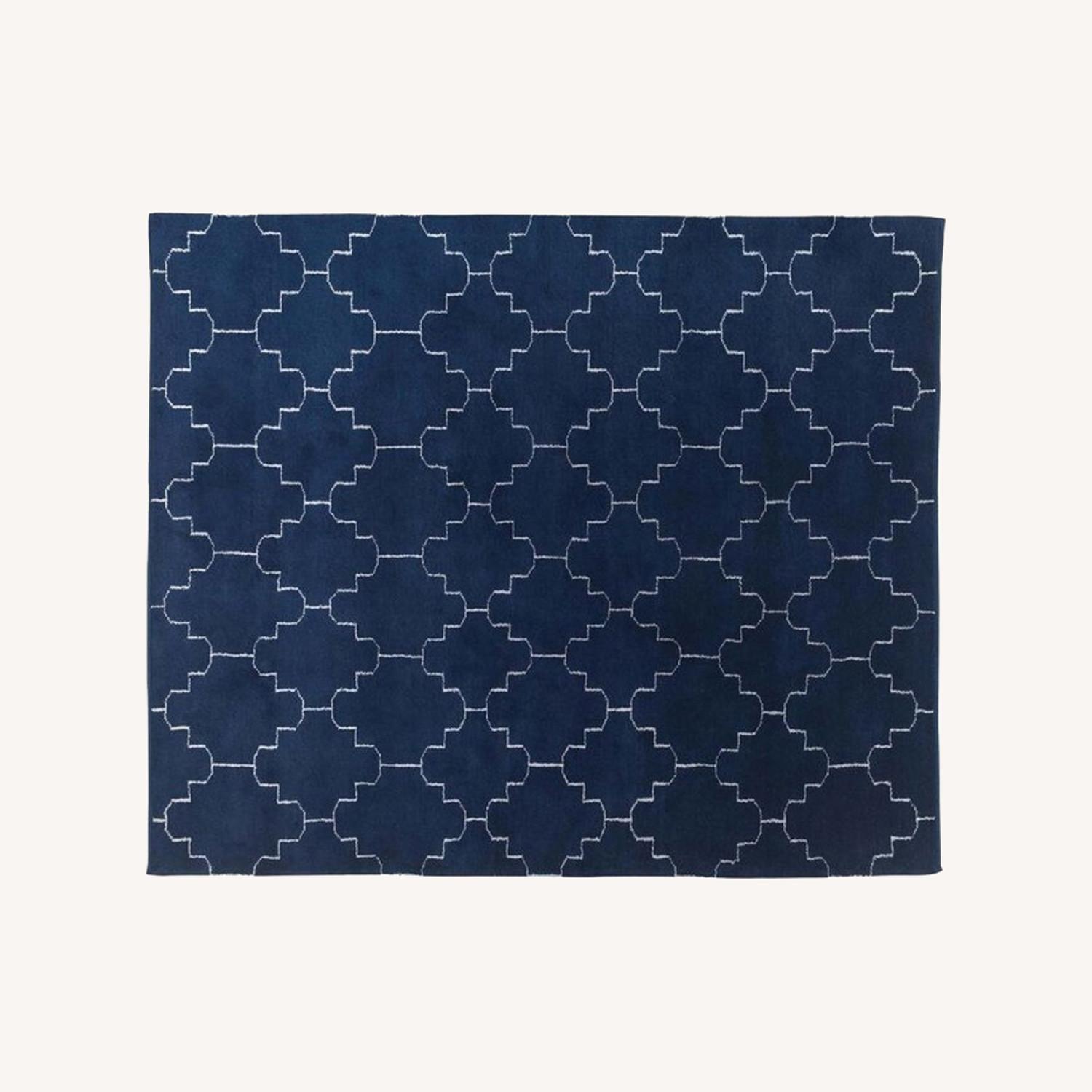 Seller's Notes:Large 11’ x 14’ geometric navy blue rug from Ethan Allen. Tulu Tracery Rug in blue with white detailing.