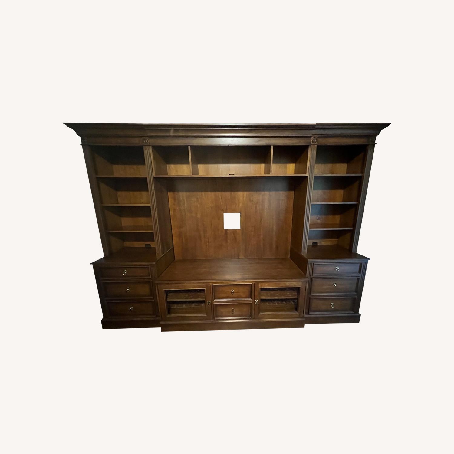 Seller's Notes:Seven pieces of entertainment center in excellent condition. Lots of storage drawers and bookshelves. There are two options to install this unit: 1) as shown with all seven pieces tied up, 2) the two bookshelves with their lower drawers together as one piece, and the TV middle piece on its own. You would not need the crown or the back panel behind the TV in this setup. Measures: 116WX82hX20d MUST SELL BY AUGUST 9, 2023, OR IT WILL GO OFFLINE AND SENT TO STORAGE