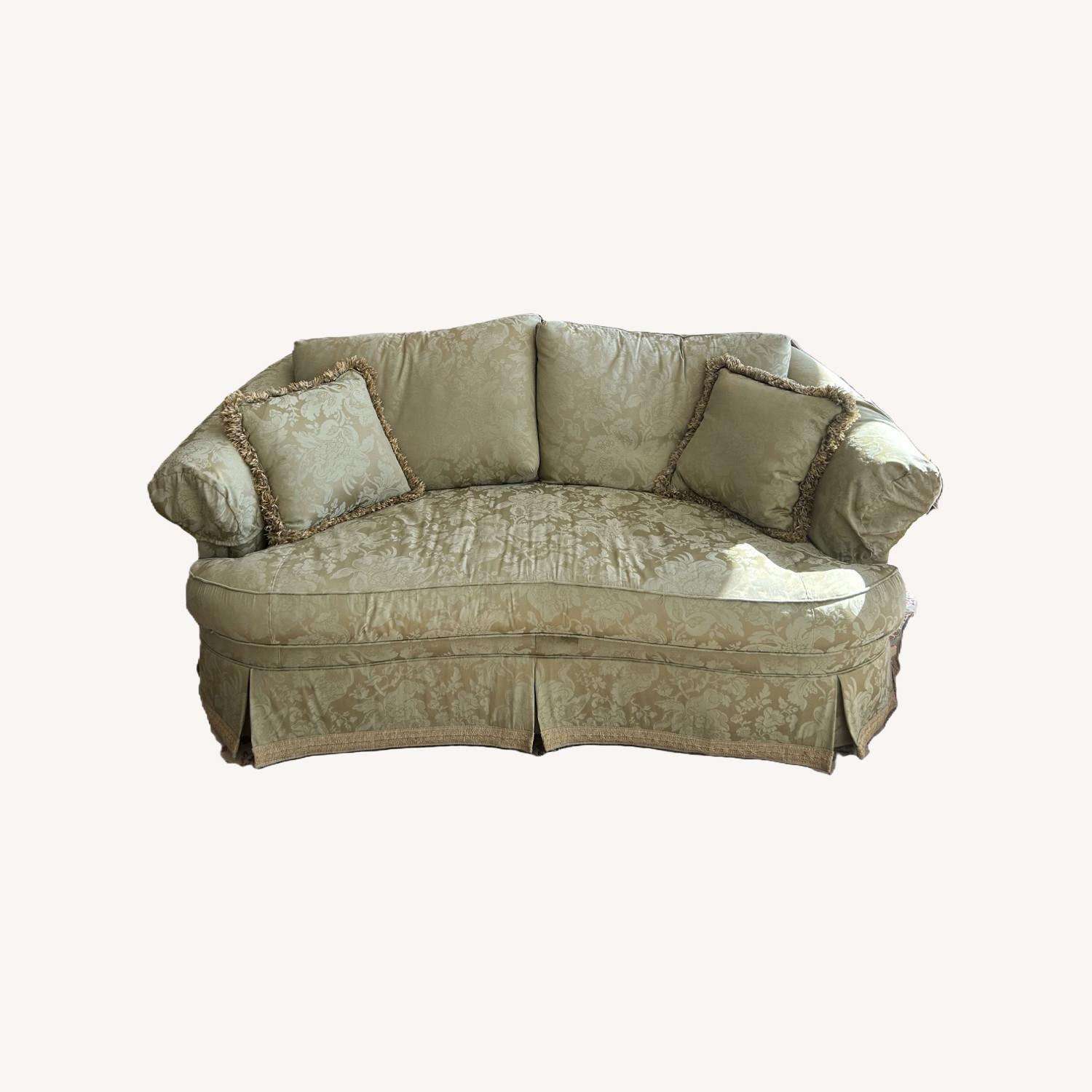 Seller's Notes:Custom designed in a soft sage-champagne damask, the fabric has a subtle woven floral pattern that catches the light and adds depth without overwhelming the room. The tone is a refined blend of muted green and warm ivory — neutral enough to work with creams, browns, and coastal palettes, yet distinctive enough to feel special. The sofa features generously cushioned back pillows, rolled arms, and a tailored skirt with decorative trim for a polished, classic look. The upholstery has a luxurious, slightly lustrous finish that elevates it beyond standard microfiber or flat linen. Because it was placed in a rarely used formal living room, it has been exceptionally well maintained and gently lived in. This is not a mass-market piece — it’s solid, high-quality Ethan Allen craftsmanship with a custom fabric selection that gives it personality and sophistication. Perfect for someone who appreciates traditional style with a fresh, elegant twist.