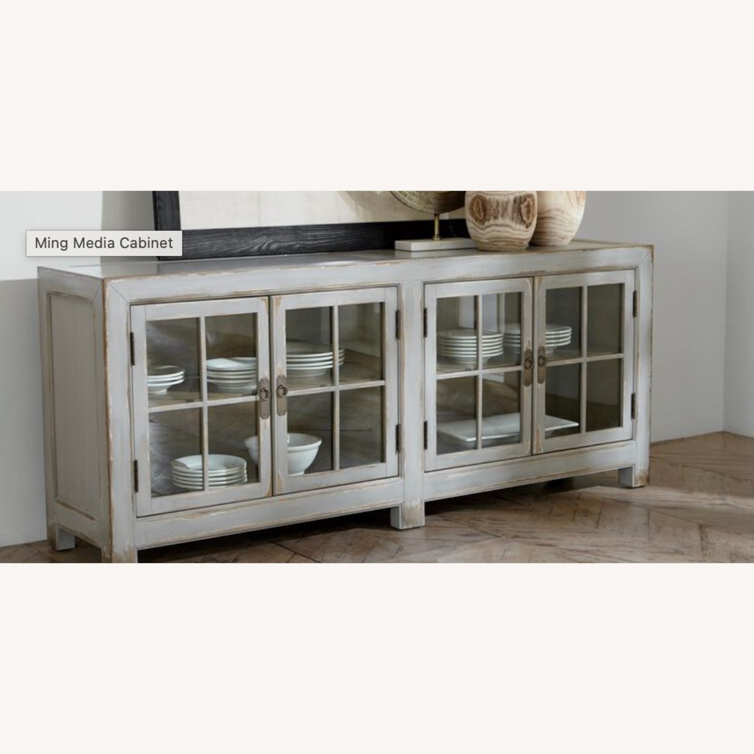 nspired by ancient Chinese cabinetry, this media cabinet offers room for stylish storage and display. Centuries ago, Ming furniture was crafted from the timber of indigenous trees, just like ours is today. With its artful distressing and windowpane mullions, Ming has the look of an antique that’s been cherished for generations. Crafted from poplar wood solids and hand planed maple veneer Four wood-framed glass doors One adjustable shelf behind each pair of doors, wire access holes in back panel Compound miter corner detailing Distressed surfaces