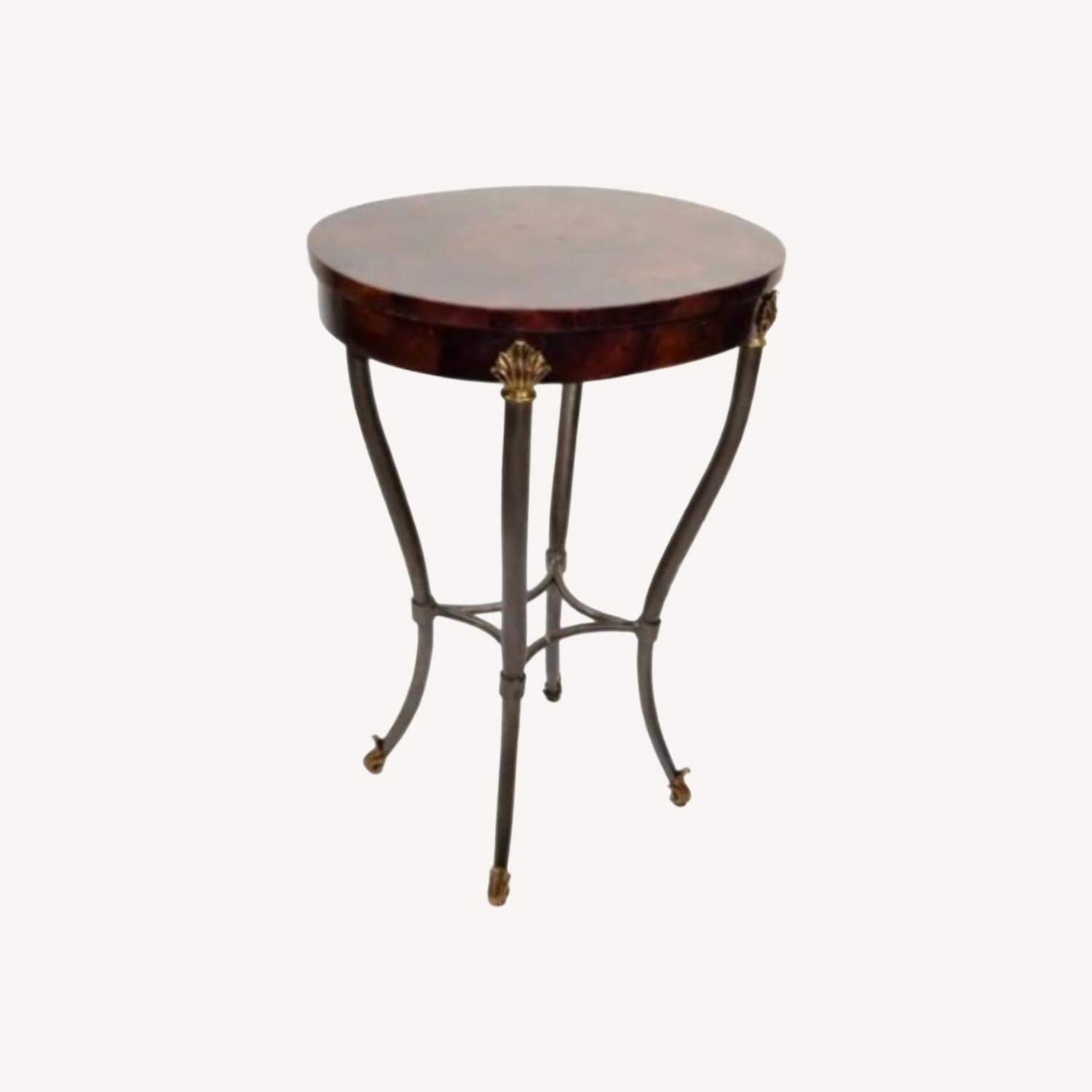 Seller's Notes:Hollywood Regency Style Period Faux Tessellated Horn over Wood Oval Side or Accent Table Features a dark silver Wrought Iron base with an oval Horn over Wood Tabletop decorated with Brass Seashells and Scroll feet. Great condition, I don’t see any flaws, if there are any, it’s not noticeable. Currently older vintage models are for sale else where much higher than mine is priced here.