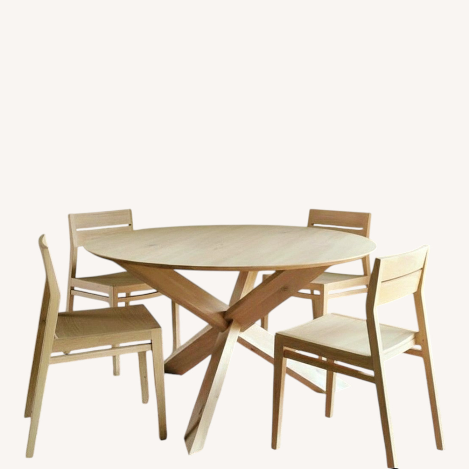 Seller's Notes:Beautiful Ethnicraft Oak Bok Round Extendable Dining Table with 4 matching Oak Bok Dining Chairs. This stunning set is all about inspiring your family to spend time at the table. The table features sturdy legs that gracefully intertwine, creating a perfect balance and visual appeal. Made with varnished solid oak, it's a stunning centerpiece for any dining space with exceptional craftsmanship. Purchased about 1 year ago and in excellent condition. Table extends to seat more guests comfortably. Will include the oil cloth pictured if interested.