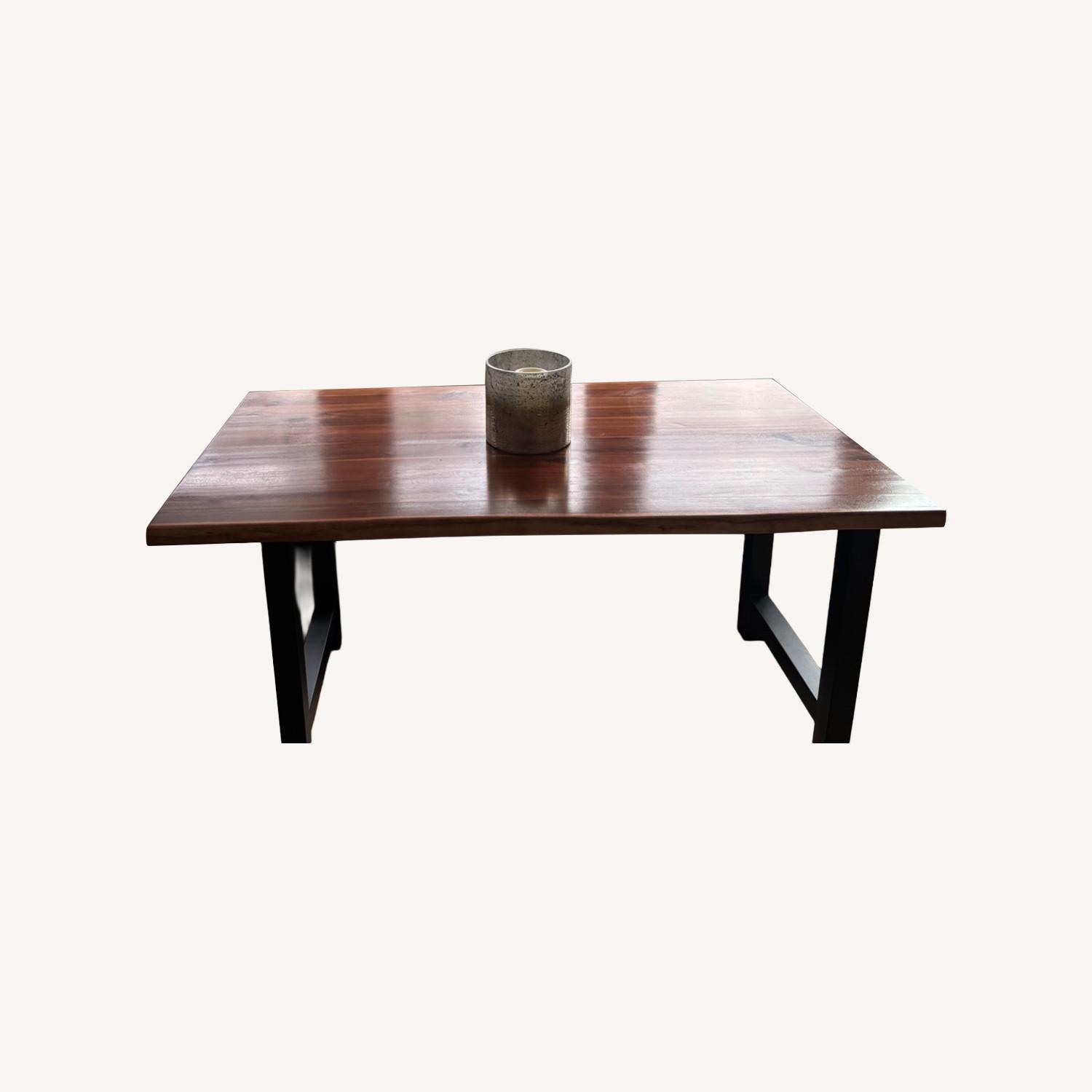 Seller's Notes:Beautiful walnut wood table, can be used as a study table, dining table or arts and crafts table. It is only 2 months old. The legs can be removed and drilled closer to the side or more in the center of the table. Note that this is a live edge table on one side (very gentle) and has some natural variations in the wood /detailing.